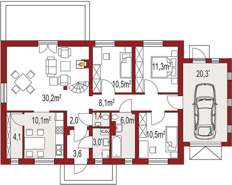 Graficzne opracowanie rzutów poglądowych widocznych na karcie projektu zostało wykonane przez Extradom.pl. Prezentowane przez Extradom.pl wizualizacje wykonane zostały przez autora projektu i należy poczytywać je jedynie za przykład i propozycję wykończenia, wizję architektoniczną autora projektu. Ostateczne wykończenie budynku może nastąpić na wiele sposobów. Szczegółowe rozwiązania zastosowane w oferowanej dokumentacji - w tym również ilość, lokalizacje i wygląd okien, drzwi, kominów - mogą w niewielkim stopniu różnić się od prezentowanej wizualizacji budynku.