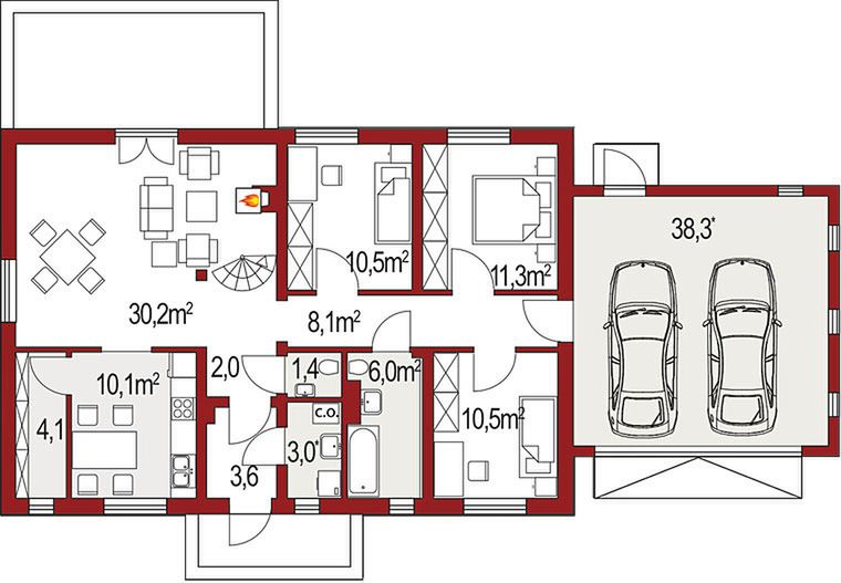 Graficzne opracowanie rzutów poglądowych widocznych na karcie projektu zostało wykonane przez Extradom.pl. Prezentowane przez Extradom.pl wizualizacje wykonane zostały przez autora projektu i należy poczytywać je jedynie za przykład i propozycję wykończenia, wizję architektoniczną autora projektu. Ostateczne wykończenie budynku może nastąpić na wiele sposobów. Szczegółowe rozwiązania zastosowane w oferowanej dokumentacji - w tym również ilość, lokalizacje i wygląd okien, drzwi, kominów - mogą w niewielkim stopniu różnić się od prezentowanej wizualizacji budynku.