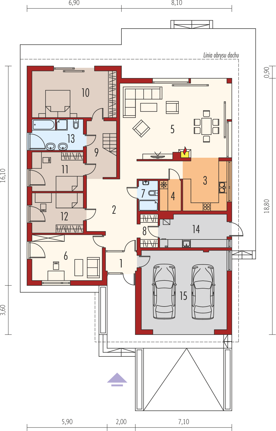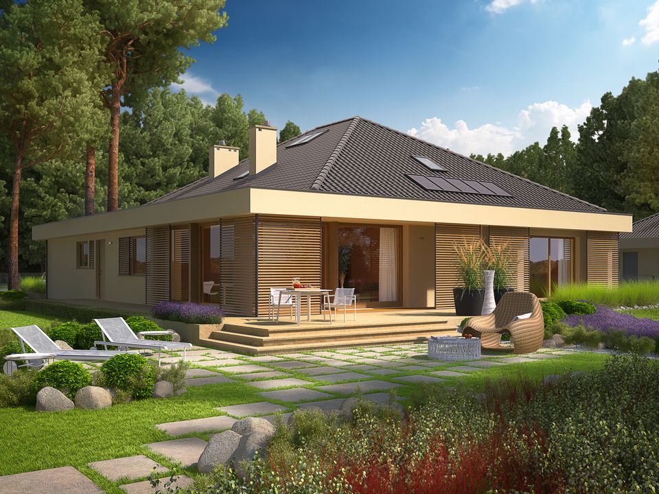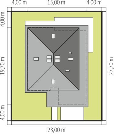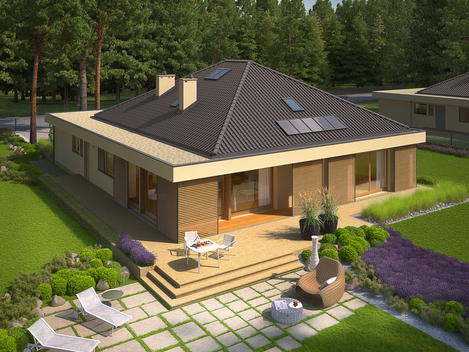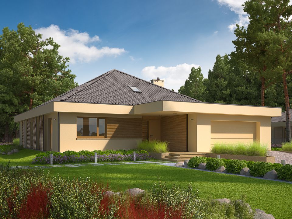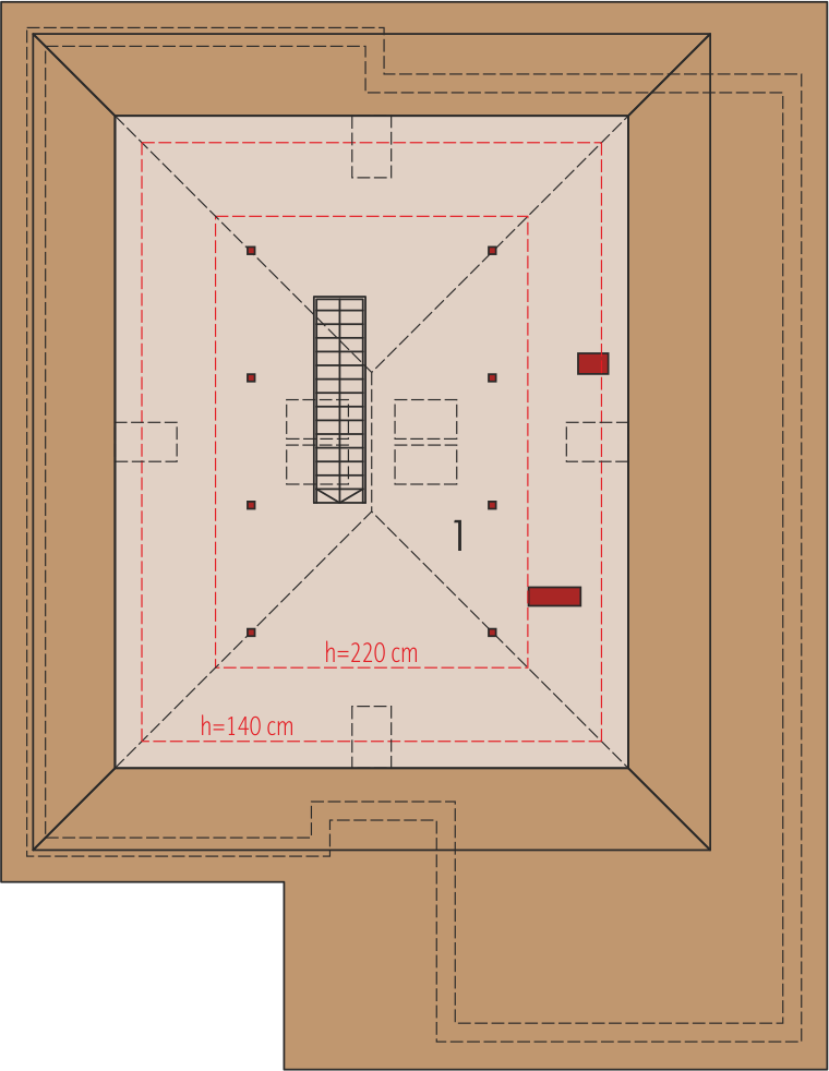 Graficzne opracowanie rzutów poglądowych widocznych na karcie projektu zostało wykonane przez Extradom.pl. Prezentowane przez Extradom.pl wizualizacje wykonane zostały przez autora projektu i należy poczytywać je jedynie za przykład i propozycję wykończenia, wizję architektoniczną autora projektu. Ostateczne wykończenie budynku może nastąpić na wiele sposobów. Szczegółowe rozwiązania zastosowane w oferowanej dokumentacji - w tym również ilość, lokalizacje i wygląd okien, drzwi, kominów - mogą w niewielkim stopniu różnić się od prezentowanej wizualizacji budynku.