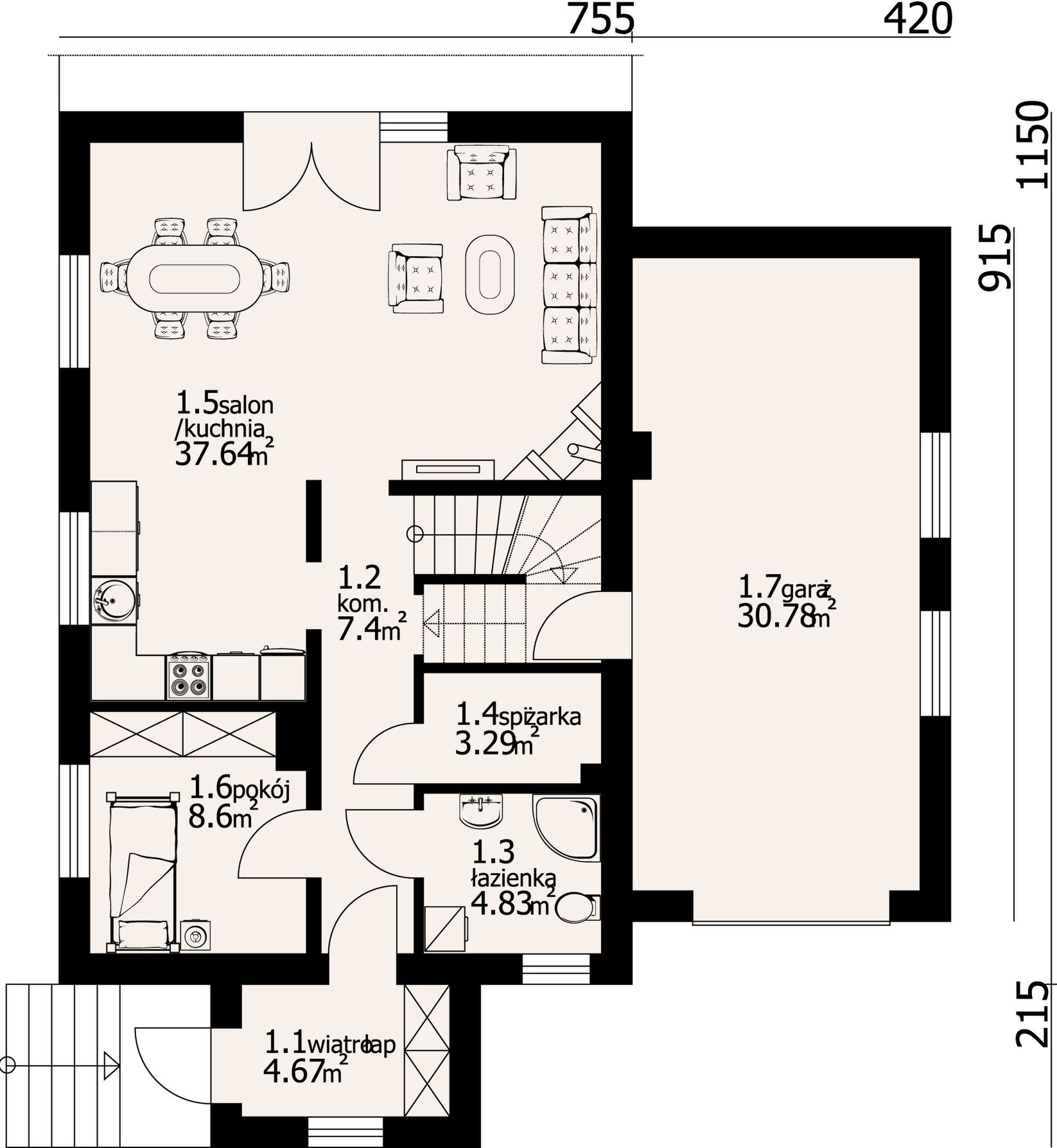 Wysokość ścianki kolankowej: 1.25 m. Strop: płyta żelbetowa. Pokrycie dachu: dachówka ceramiczna. Ściany zewnętrzne: pustaki ceramiczne + styropian. Ściany wewnętrzne: pustaki ceramiczne. Typ ogrzewania: kocioł gazowy lub kocioł na paliwo stałe.