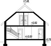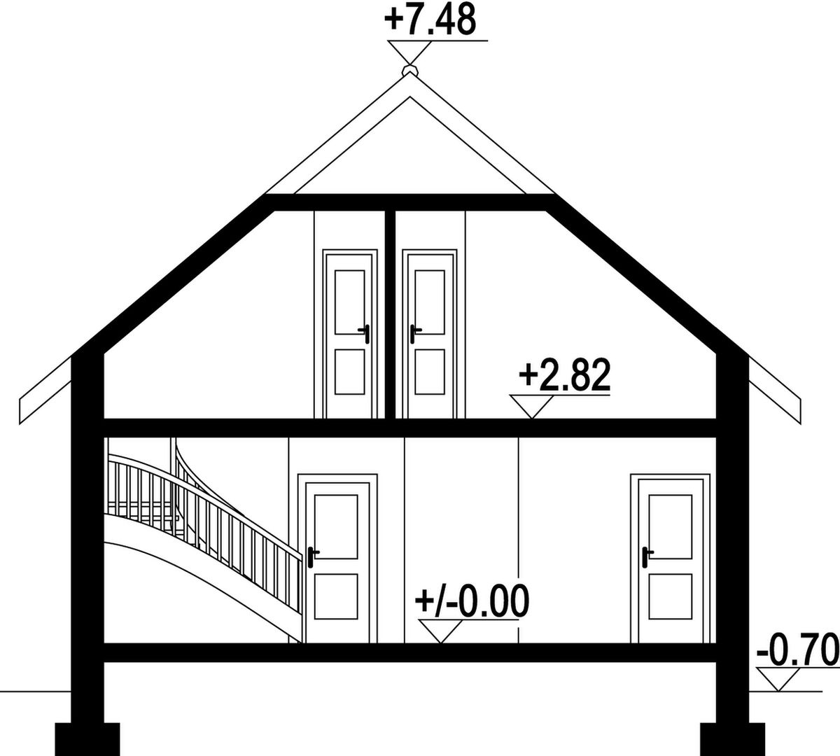 Wysokość ścianki kolankowej: 0.9 m. Strop: płyta żelbetowa. Pokrycie dachu: dachówka ceramiczna. Ściany zewnętrzne: pustaki ceramiczne + styropian. Ściany wewnętrzne: pustaki ceramiczne. Typ ogrzewania: kocioł gazowy lub kocioł na paliwo stałe.