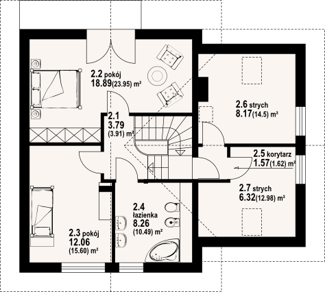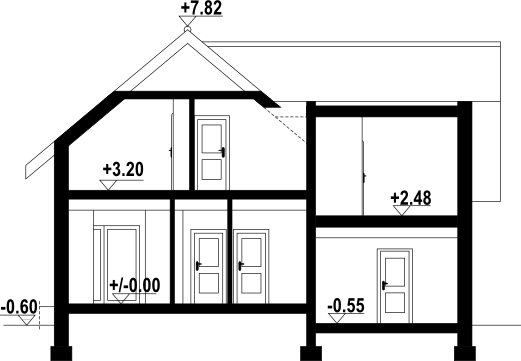 Wysokość ścianki kolankowej: 1.27 m. Strop: płyta żelbetowa. Pokrycie dachu: dachówka ceramiczna. Ściany zewnętrzne: bloczki z betonu komórkowego + styropian. Ściany wewnętrzne: bloczki z betonu komórkowego. Typ ogrzewania: kocioł gazowy lub kocioł na paliwo stałe. Instalacje dodatkowe: instalacja wentylacji mech. z rekuperacją. Inne: okna połaciowe Velux.