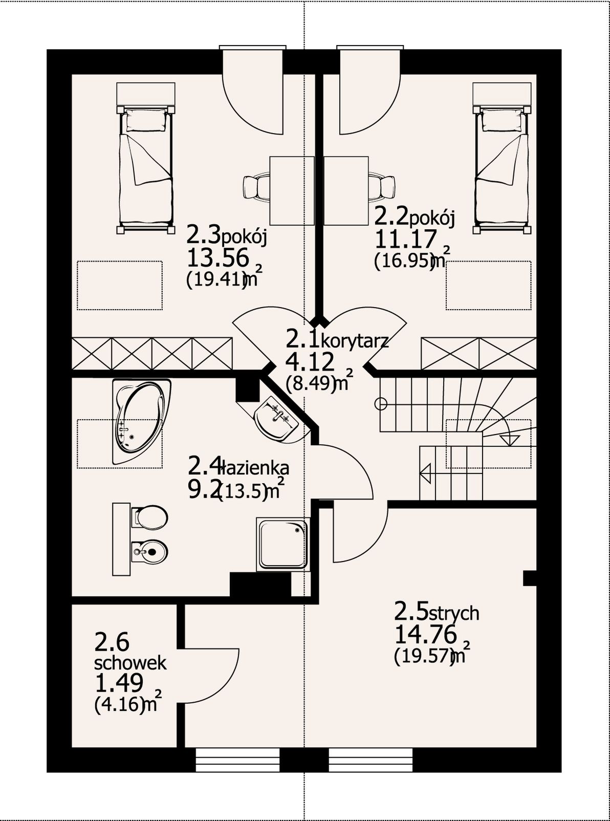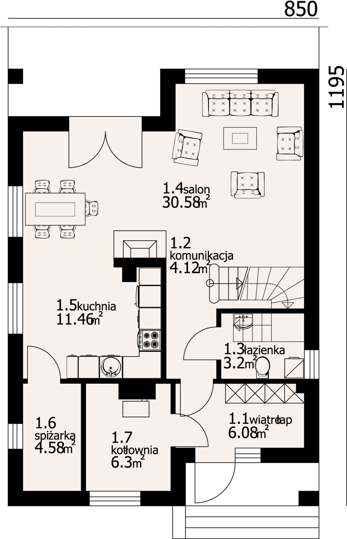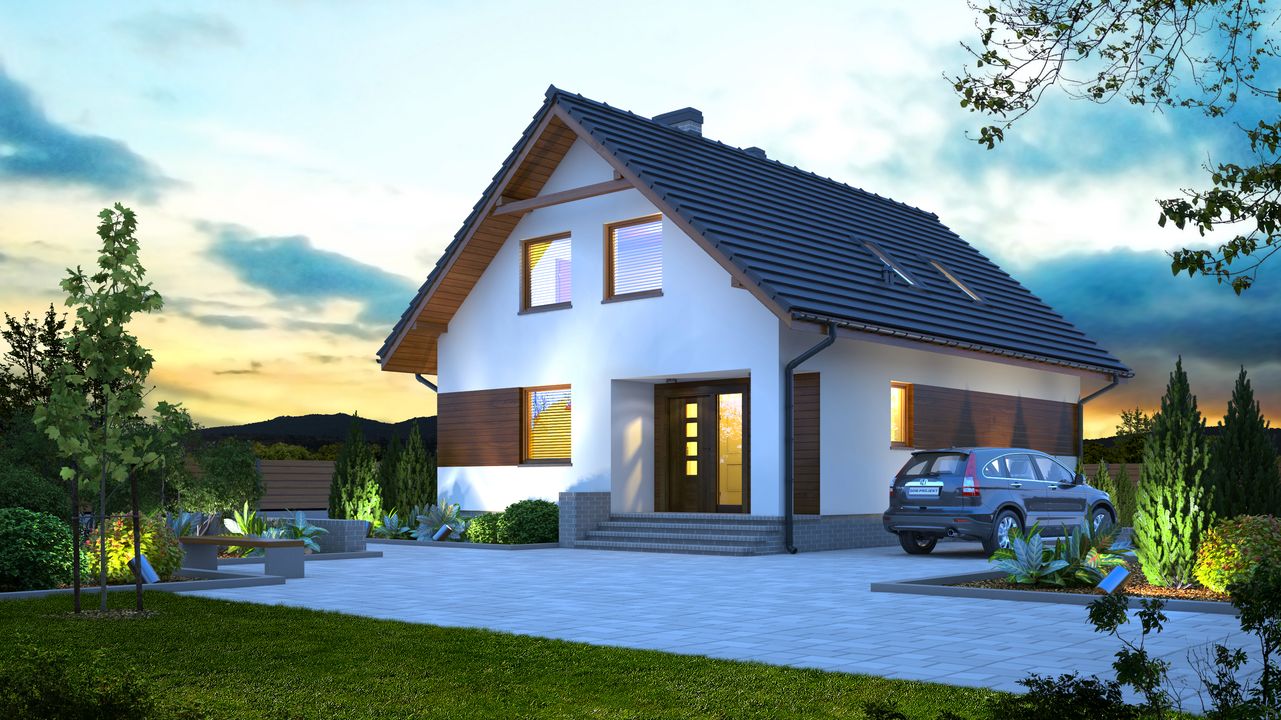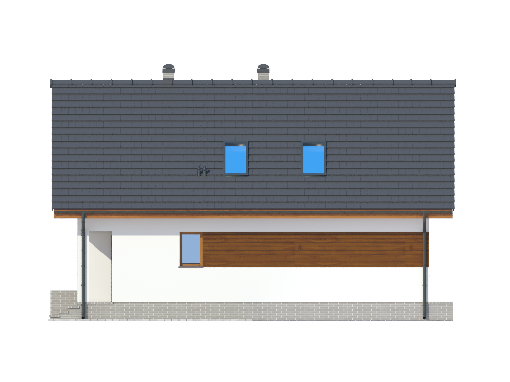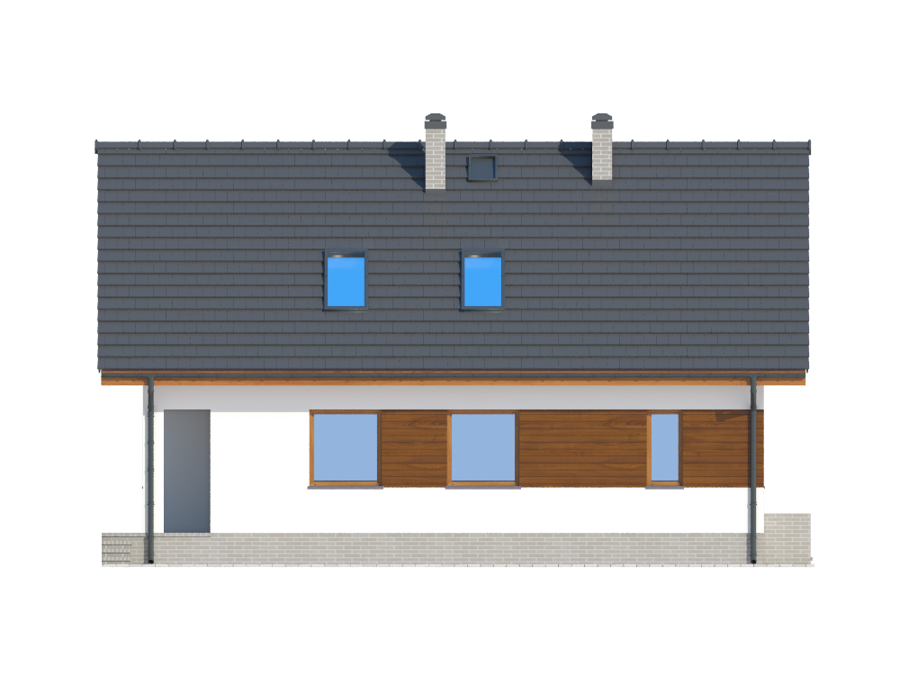 Graficzne opracowanie rzutów poglądowych widocznych na karcie projektu zostało wykonane przez Extradom.pl. Prezentowane przez Extradom.pl wizualizacje wykonane zostały przez autora projektu i należy poczytywać je jedynie za przykład i propozycję wykończenia, wizję architektoniczną autora projektu. Ostateczne wykończenie budynku może nastąpić na wiele sposobów. Szczegółowe rozwiązania zastosowane w oferowanej dokumentacji - w tym również ilość, lokalizacje i wygląd okien, drzwi, kominów - mogą w niewielkim stopniu różnić się od prezentowanej wizualizacji budynku.