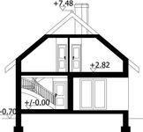 Wysokość ścianki kolankowej: 0.9 m. Strop: płyta żelbetowa. Pokrycie dachu: dachówka ceramiczna. Ściany zewnętrzne: pustaki ceramiczne + styropian. Ściany wewnętrzne: pustaki ceramiczne. Typ ogrzewania: kocioł gazowy lub kocioł na paliwo stałe. Inne: okna połaciowe Fakro.