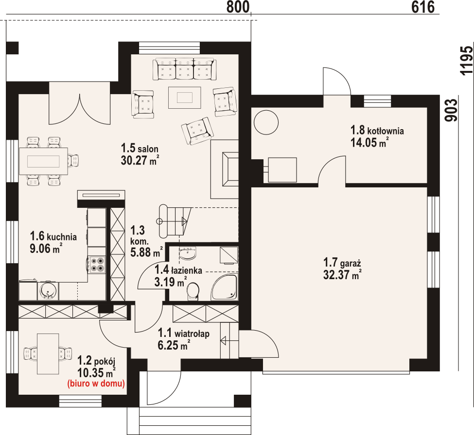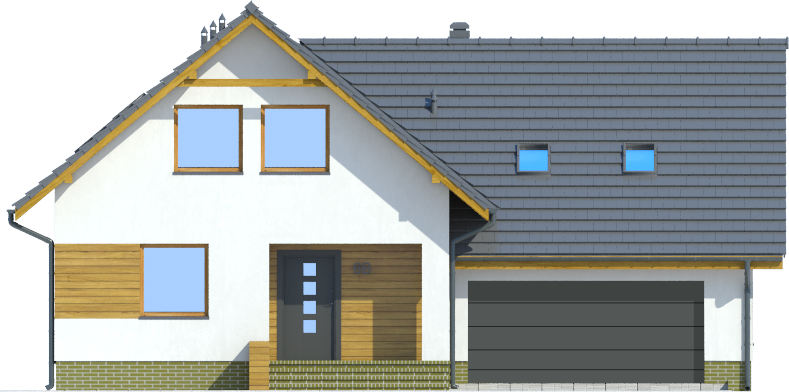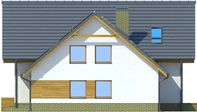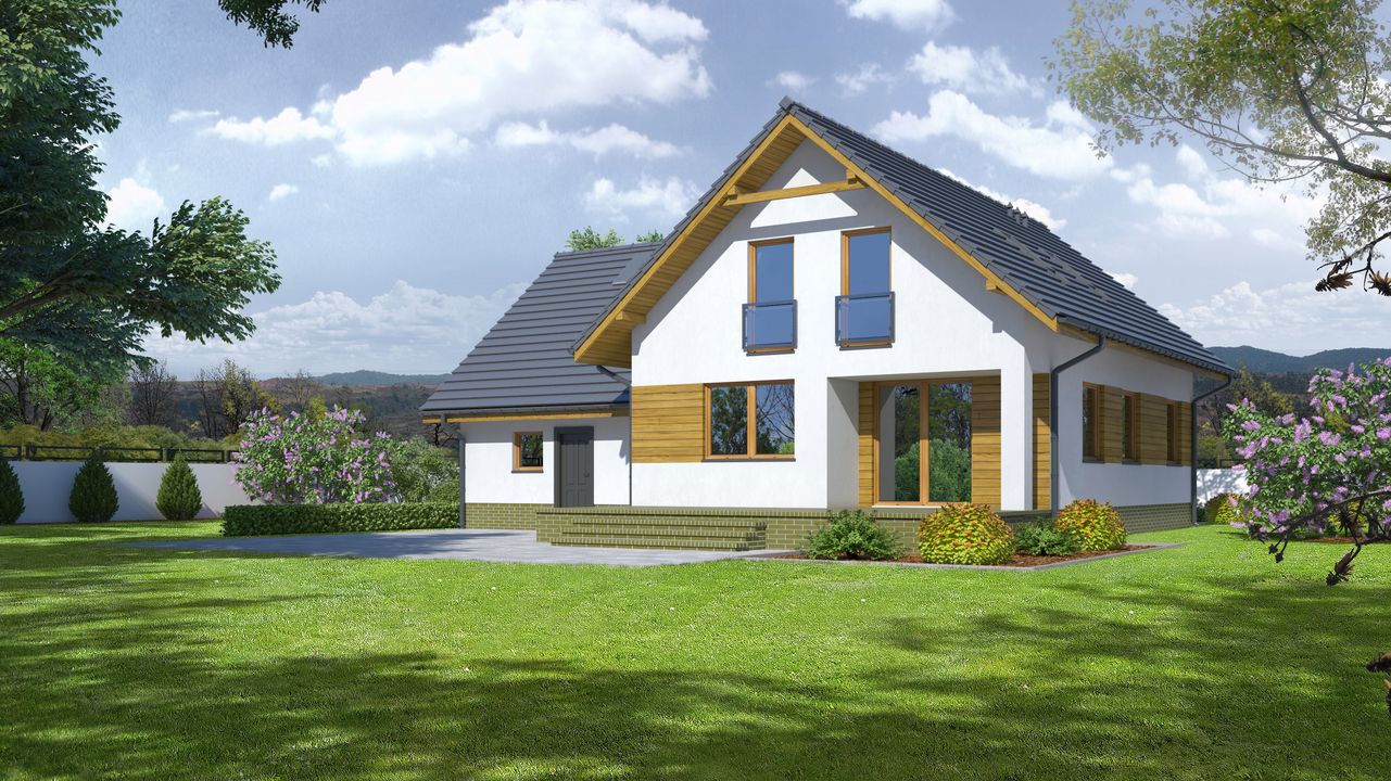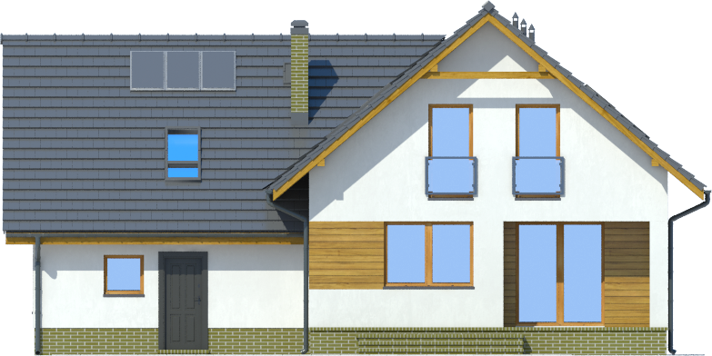 Graficzne opracowanie rzutów poglądowych widocznych na karcie projektu zostało wykonane przez Extradom.pl. Prezentowane przez Extradom.pl wizualizacje wykonane zostały przez autora projektu i należy poczytywać je jedynie za przykład i propozycję wykończenia, wizję architektoniczną autora projektu. Ostateczne wykończenie budynku może nastąpić na wiele sposobów. Szczegółowe rozwiązania zastosowane w oferowanej dokumentacji - w tym również ilość, lokalizacje i wygląd okien, drzwi, kominów - mogą w niewielkim stopniu różnić się od prezentowanej wizualizacji budynku.