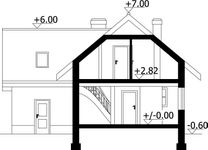 Wysokość ścianki kolankowej: 1.05 m. Strop: płyta żelbetowa. Pokrycie dachu: dachówka ceramiczna. Ściany zewnętrzne: pustaki ceramiczne + styropian. Ściany wewnętrzne: pustaki ceramiczne. Typ ogrzewania: kocioł gazowy lub kocioł na paliwo stałe. Inne: okna połaciowe Velux, brama garażowa Hörmann.