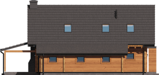 Wysokość ścianki kolankowej: 0.92 m. Strop: drewniany. Pokrycie dachu: dachówka gontopodobna Gerard Corona. Ściany zewnętrzne: płazy drewniane + wełna mineralna + deska. Ściany wewnętrzne: płazy drewniane. Typ ogrzewania: pompa ciepła. Instalacje dodatkowe: panele fotowoltaiczne. Inne: okna połaciowe Velux.
