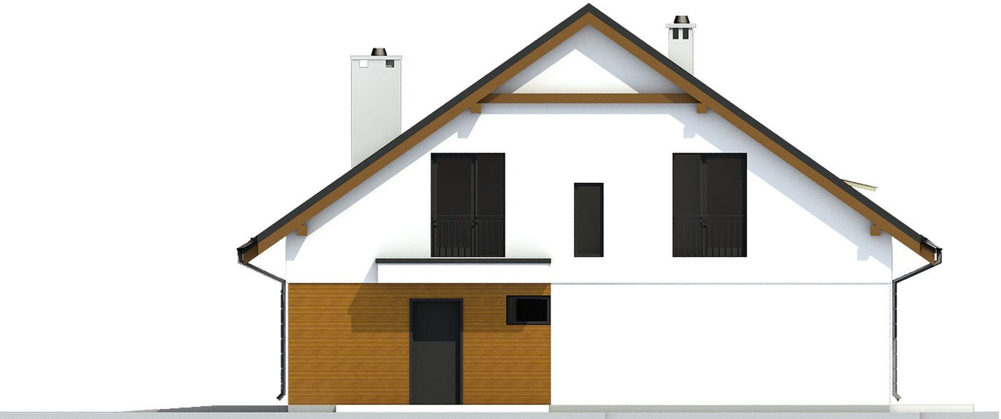 Projekt charakteryzuje się zwartą bryłą w tradycyjnym stylu, idealnie wpisującą się w zabudowę bliźniaczą. Przykryty dwuspadowym dachem z kalenicą równoległą do drogi, dom prezentuje się klasycznie i ponadczasowo. Takie rozwiązanie konstrukcyjne jest nie tylko estetyczne, ale również sprawdzone i ekonomiczne w realizacji. Uroku dodaje klasyczny okap dachowy, a dodatkowe doświetlenie poddasza zapewniają trzy okna połaciowe. Garaż został zgrabnie wkomponowany w bryłę budynku, tworząc spójną i harmonijną całość.