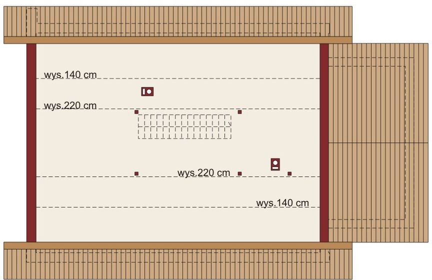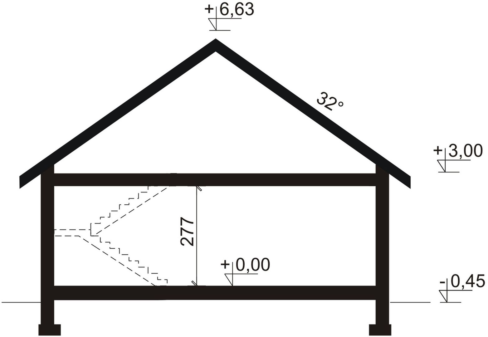 Fundamenty: bezpośrednie, na ławach i stopach fundamentowych. Ściany zewnętrzne: bloczki z bet. komórkowego - 24 cm + styropian TERMO ORGANIKA typ Fasada 12 cm. Ściany wewnętrzne: bloczki z bet. komórkowego - 24 cm (działowe - 12 cm). Strop: belki drewniane. Elewacje: tynk - System Platinum firmy TERMO ORGANIKA, deska elewacyjna, okładzina kamienna lub płyta włóknocementowa. Pokrycie dachu: dachówka cementowa zakładkowa. Konstrukcja dachu: drewniana o układzie konstrukcyjnym mieszanym. Schody wewnętrzne: wyłaz na poddasze. Ogrzewanie: kocioł gazowy jednofunkcyjny kondensacyjny, dodatkowe źródło ciepła - kominek z płaszczem wodnym Projekt zgodny z wymaganiami WT2017..