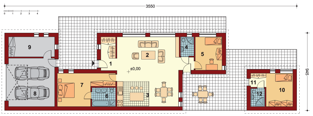 Graficzne opracowanie rzutów poglądowych widocznych na karcie projektu zostało wykonane przez Extradom.pl. Prezentowane przez Extradom.pl wizualizacje wykonane zostały przez autora projektu i należy poczytywać je jedynie za przykład i propozycję wykończenia, wizję architektoniczną autora projektu. Ostateczne wykończenie budynku może nastąpić na wiele sposobów. Szczegółowe rozwiązania zastosowane w oferowanej dokumentacji - w tym również ilość, lokalizacje i wygląd okien, drzwi, kominów - mogą w niewielkim stopniu różnić się od prezentowanej wizualizacji budynku.