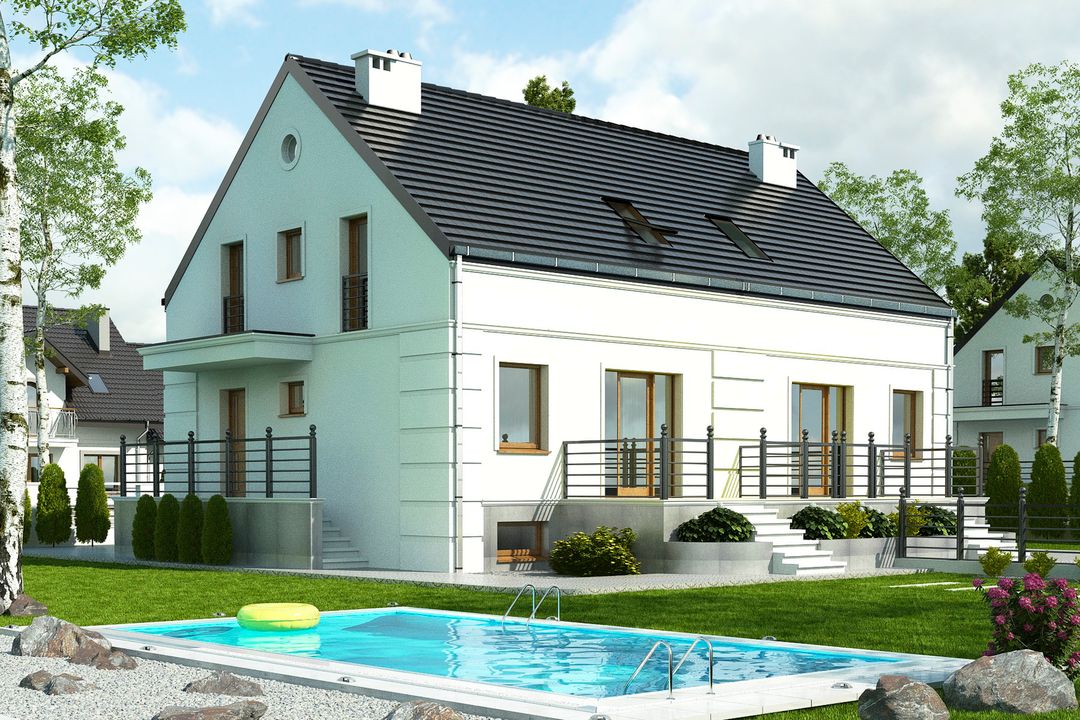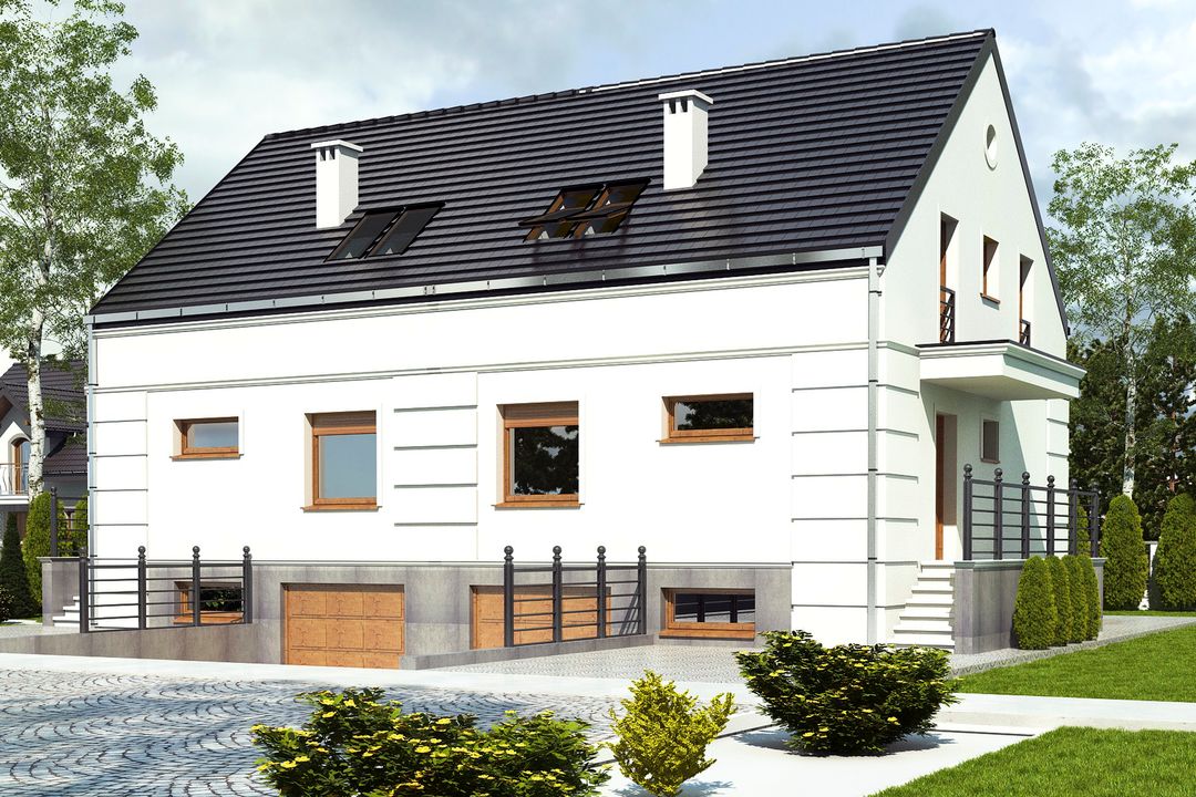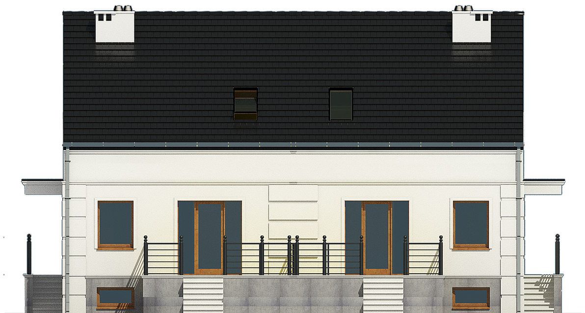 Graficzne opracowanie rzutów poglądowych widocznych na karcie projektu zostało wykonane przez Extradom.pl. Prezentowane przez Extradom.pl wizualizacje wykonane zostały przez autora projektu i należy poczytywać je jedynie za przykład i propozycję wykończenia, wizję architektoniczną autora projektu. Ostateczne wykończenie budynku może nastąpić na wiele sposobów. Szczegółowe rozwiązania zastosowane w oferowanej dokumentacji - w tym również ilość, lokalizacje i wygląd okien, drzwi, kominów - mogą w niewielkim stopniu różnić się od prezentowanej wizualizacji budynku.