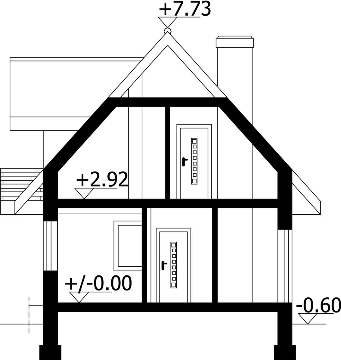 Wysokość ścianki kolankowej: 0.79 m. Strop: płyta żelbetowa. Pokrycie dachu: dachówka ceramiczna. Ściany zewnętrzne: pustaki ceramiczne + styropian. Ściany wewnętrzne: pustaki ceramiczne. Typ ogrzewania: kocioł gazowy lub kocioł na paliwo stałe.