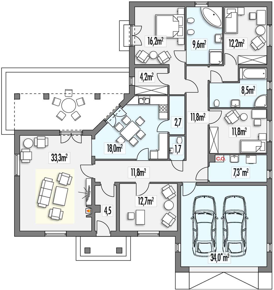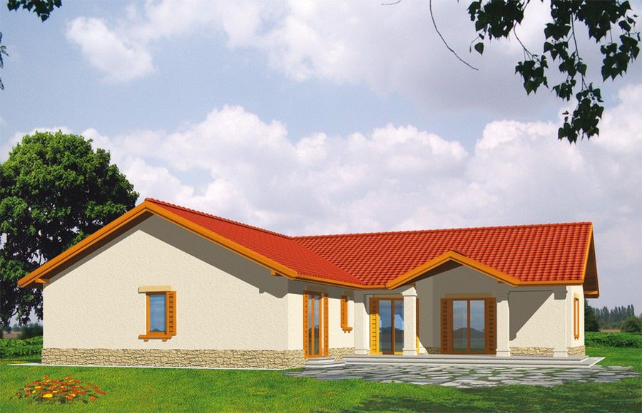 Graficzne opracowanie rzutów poglądowych widocznych na karcie projektu zostało wykonane przez Extradom.pl. Prezentowane przez Extradom.pl wizualizacje wykonane zostały przez autora projektu i należy poczytywać je jedynie za przykład i propozycję wykończenia, wizję architektoniczną autora projektu. Ostateczne wykończenie budynku może nastąpić na wiele sposobów. Szczegółowe rozwiązania zastosowane w oferowanej dokumentacji - w tym również ilość, lokalizacje i wygląd okien, drzwi, kominów - mogą w niewielkim stopniu różnić się od prezentowanej wizualizacji budynku.