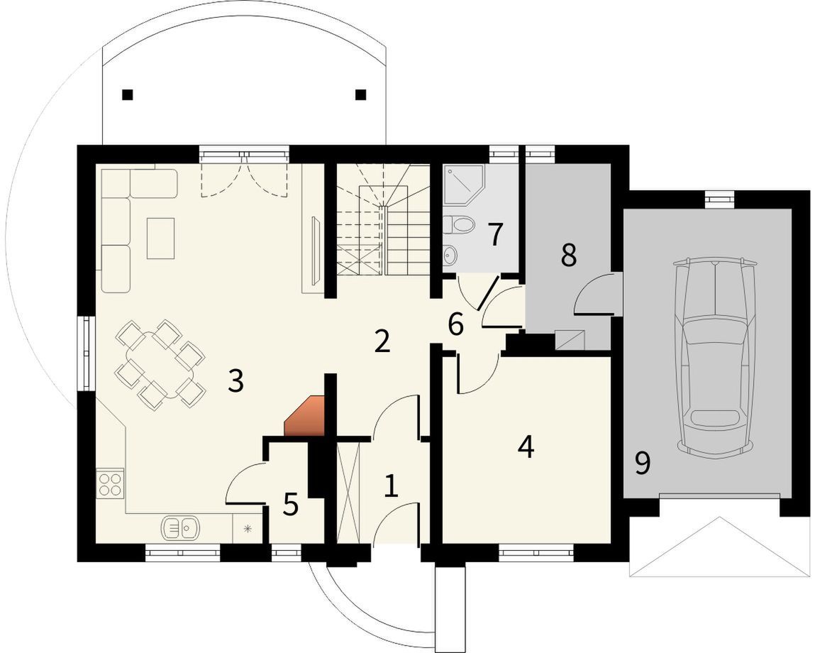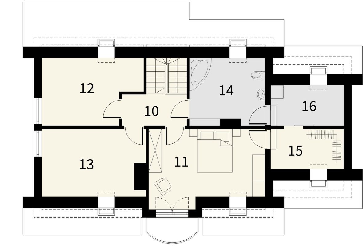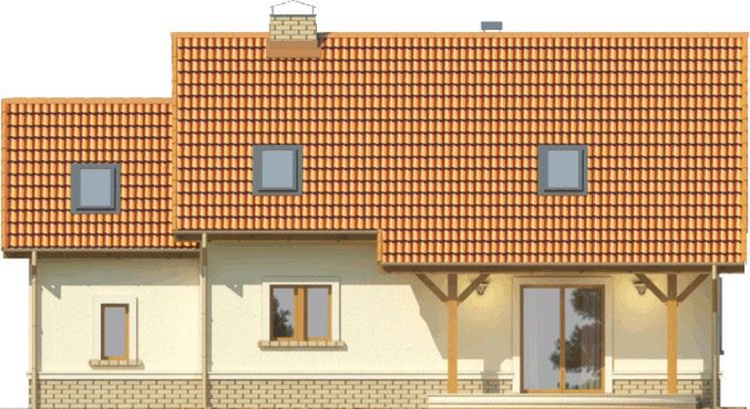 Graficzne opracowanie rzutów poglądowych widocznych na karcie projektu zostało wykonane przez Extradom.pl. Prezentowane przez Extradom.pl wizualizacje wykonane zostały przez autora projektu i należy poczytywać je jedynie za przykład i propozycję wykończenia, wizję architektoniczną autora projektu. Ostateczne wykończenie budynku może nastąpić na wiele sposobów. Szczegółowe rozwiązania zastosowane w oferowanej dokumentacji - w tym również ilość, lokalizacje i wygląd okien, drzwi, kominów - mogą w niewielkim stopniu różnić się od prezentowanej wizualizacji budynku.
