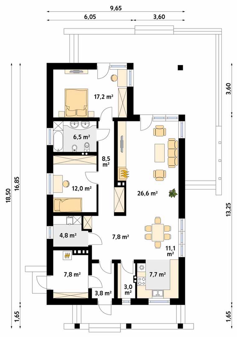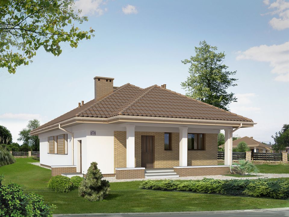 Graficzne opracowanie rzutów poglądowych widocznych na karcie projektu zostało wykonane przez Extradom.pl. Prezentowane przez Extradom.pl wizualizacje wykonane zostały przez autora projektu i należy poczytywać je jedynie za przykład i propozycję wykończenia, wizję architektoniczną autora projektu. Ostateczne wykończenie budynku może nastąpić na wiele sposobów. Szczegółowe rozwiązania zastosowane w oferowanej dokumentacji - w tym również ilość, lokalizacje i wygląd okien, drzwi, kominów - mogą w niewielkim stopniu różnić się od prezentowanej wizualizacji budynku.