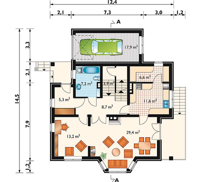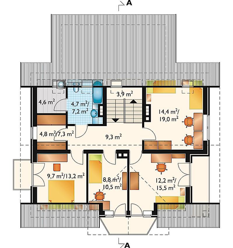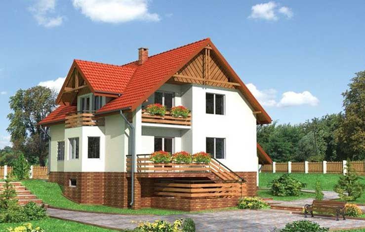 Graficzne opracowanie rzutów poglądowych widocznych na karcie projektu zostało wykonane przez Extradom.pl. Prezentowane przez Extradom.pl wizualizacje wykonane zostały przez autora projektu i należy poczytywać je jedynie za przykład i propozycję wykończenia, wizję architektoniczną autora projektu. Ostateczne wykończenie budynku może nastąpić na wiele sposobów. Szczegółowe rozwiązania zastosowane w oferowanej dokumentacji - w tym również ilość, lokalizacje i wygląd okien, drzwi, kominów - mogą w niewielkim stopniu różnić się od prezentowanej wizualizacji budynku.