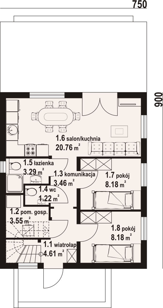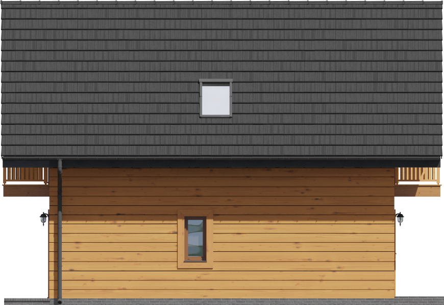 Graficzne opracowanie rzutów poglądowych widocznych na karcie projektu zostało wykonane przez Extradom.pl. Prezentowane przez Extradom.pl wizualizacje wykonane zostały przez autora projektu i należy poczytywać je jedynie za przykład i propozycję wykończenia, wizję architektoniczną autora projektu. Ostateczne wykończenie budynku może nastąpić na wiele sposobów. Szczegółowe rozwiązania zastosowane w oferowanej dokumentacji - w tym również ilość, lokalizacje i wygląd okien, drzwi, kominów - mogą w niewielkim stopniu różnić się od prezentowanej wizualizacji budynku.