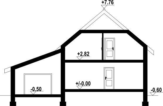 Wysokość ścianki kolankowej: 1.17 m. Strop: płyta żelbetowa. Pokrycie dachu: dachówka ceramiczna. Ściany zewnętrzne: pustaki ceramiczne + styropian. Ściany wewnętrzne: pustaki ceramiczne. Typ ogrzewania: kocioł gazowy lub kocioł na paliwo stałe.