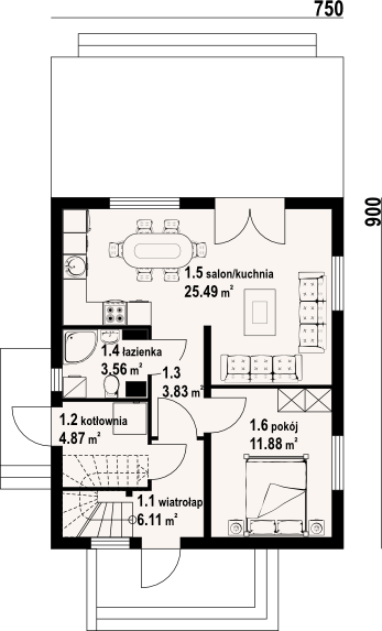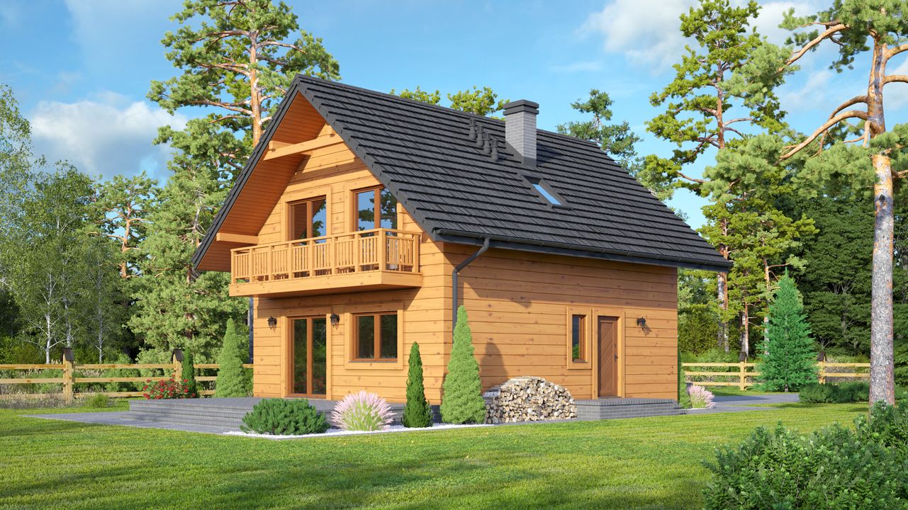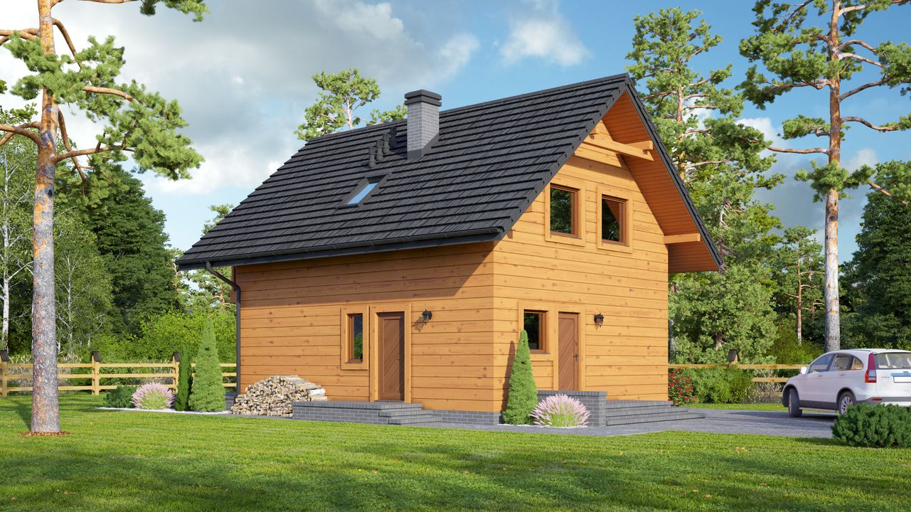 Graficzne opracowanie rzutów poglądowych widocznych na karcie projektu zostało wykonane przez Extradom.pl. Prezentowane przez Extradom.pl wizualizacje wykonane zostały przez autora projektu i należy poczytywać je jedynie za przykład i propozycję wykończenia, wizję architektoniczną autora projektu. Ostateczne wykończenie budynku może nastąpić na wiele sposobów. Szczegółowe rozwiązania zastosowane w oferowanej dokumentacji - w tym również ilość, lokalizacje i wygląd okien, drzwi, kominów - mogą w niewielkim stopniu różnić się od prezentowanej wizualizacji budynku.