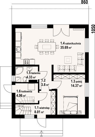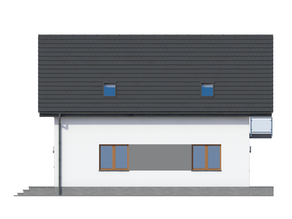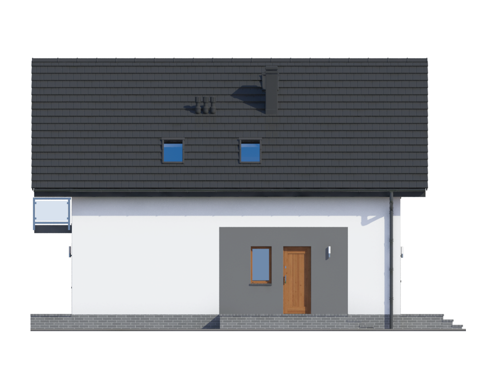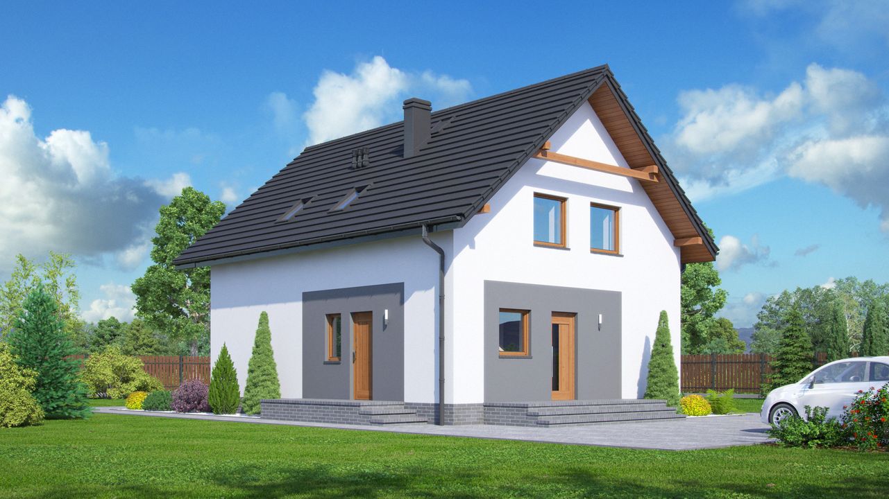 Graficzne opracowanie rzutów poglądowych widocznych na karcie projektu zostało wykonane przez Extradom.pl. Prezentowane przez Extradom.pl wizualizacje wykonane zostały przez autora projektu i należy poczytywać je jedynie za przykład i propozycję wykończenia, wizję architektoniczną autora projektu. Ostateczne wykończenie budynku może nastąpić na wiele sposobów. Szczegółowe rozwiązania zastosowane w oferowanej dokumentacji - w tym również ilość, lokalizacje i wygląd okien, drzwi, kominów - mogą w niewielkim stopniu różnić się od prezentowanej wizualizacji budynku.