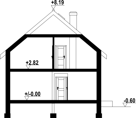 Wysokość ścianki kolankowej: 1.49 m. Strop: płyta żelbetowa. Pokrycie dachu: dachówka ceramiczna Koramic. Ściany zewnętrzne: pustaki ceramiczne Porotherm + styropian. Ściany wewnętrzne: pustaki ceramiczne Porotherm. Typ ogrzewania: kocioł gazowy lub kocioł na paliwo stałe. Inne: okna dachowe Fakro Greenview.
