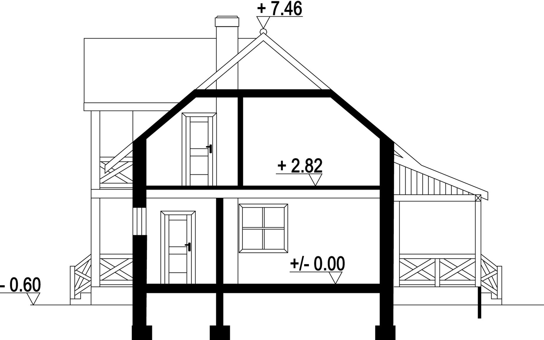 Wysokość ścianki kolankowej: 1.3 m. Ilość drewna na więźbę: 7.21 m³. Strop: drewniany. Pokrycie dachu: dachówka ceramiczna. Ściany zewnętrzne: pustaki ceramiczne + styropian. Ściany wewnętrzne: pustaki ceramiczne. Typ ogrzewania: kocioł gazowy.