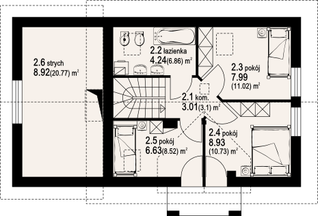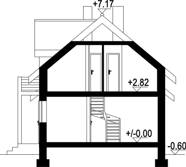 Wysokość ścianki kolankowej: 1.24 m. Ilość drewna na więźbę: 6.2 m³. Strop: płyta żelbetowa. Pokrycie dachu: dachówka ceramiczna. Ściany zewnętrzne: pustaki ceramiczne + styropian. Ściany wewnętrzne: pustaki ceramiczne. Typ ogrzewania: kocioł gazowy. Inne: okna połaciowe Fakro.