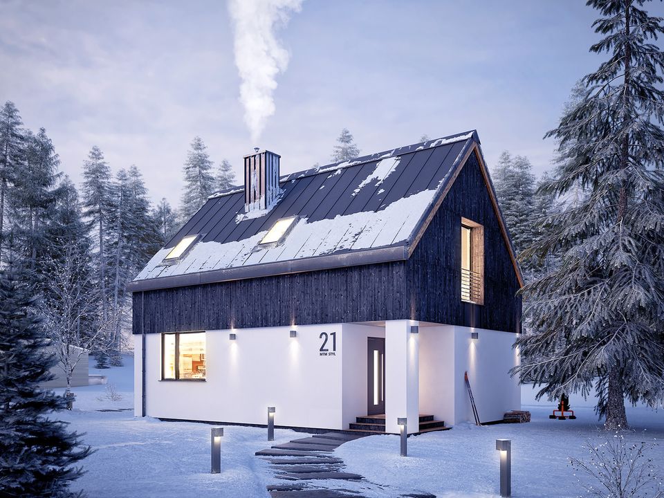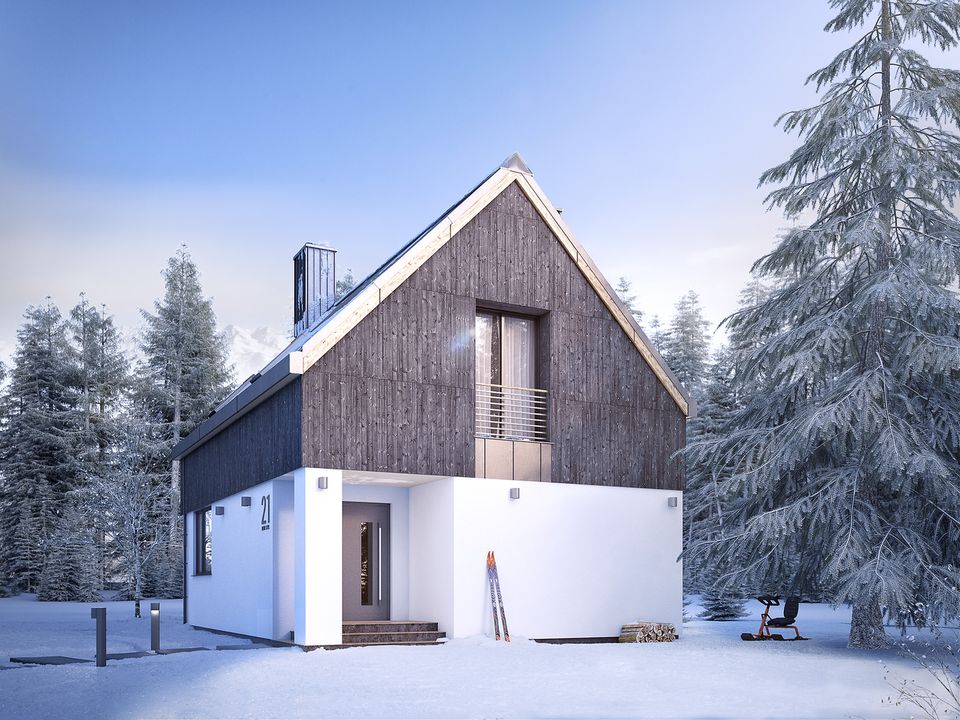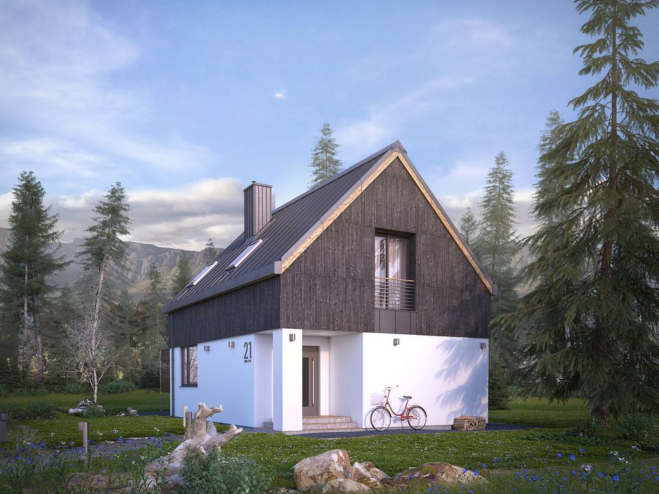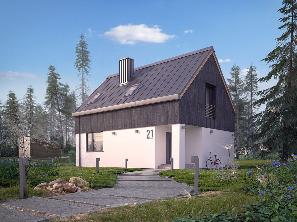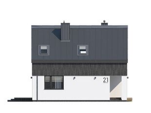 Graficzne opracowanie rzutów poglądowych widocznych na karcie projektu zostało wykonane przez Extradom.pl. Prezentowane przez Extradom.pl wizualizacje wykonane zostały przez autora projektu i należy poczytywać je jedynie za przykład i propozycję wykończenia, wizję architektoniczną autora projektu. Ostateczne wykończenie budynku może nastąpić na wiele sposobów. Szczegółowe rozwiązania zastosowane w oferowanej dokumentacji - w tym również ilość, lokalizacje i wygląd okien, drzwi, kominów - mogą w niewielkim stopniu różnić się od prezentowanej wizualizacji budynku.