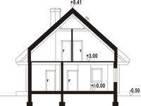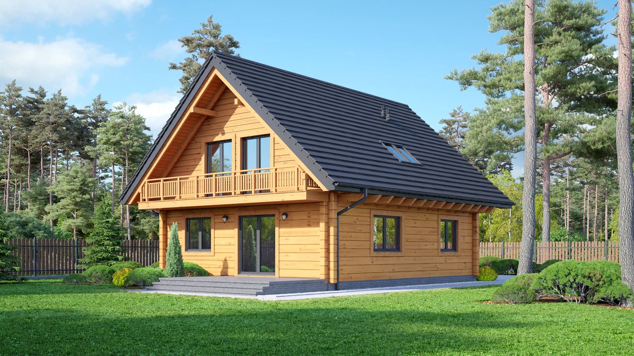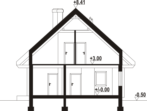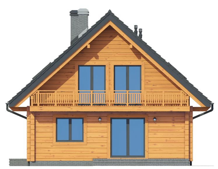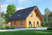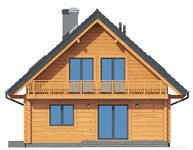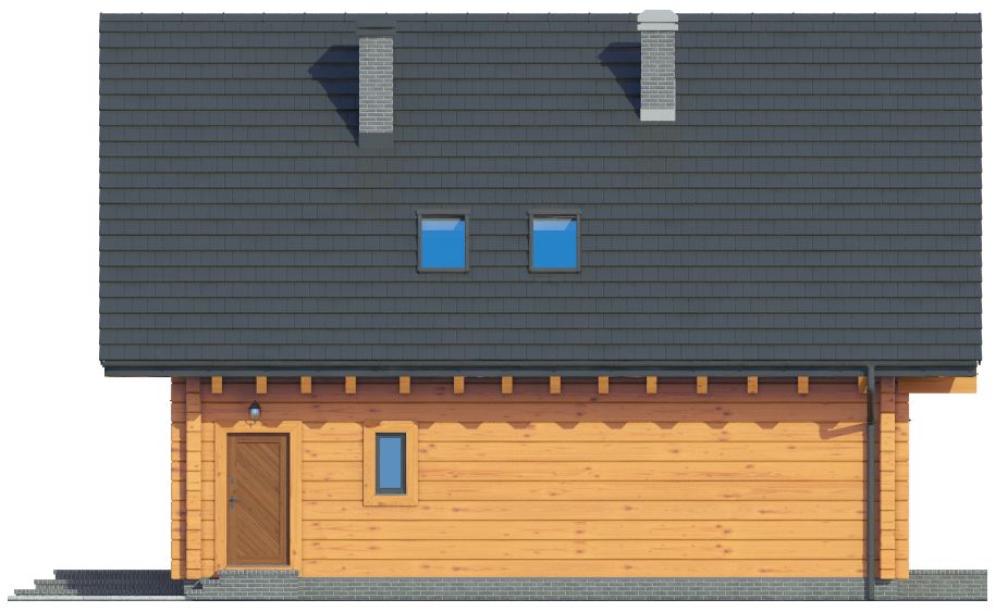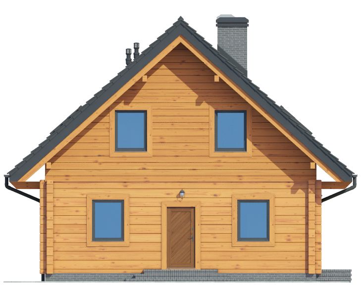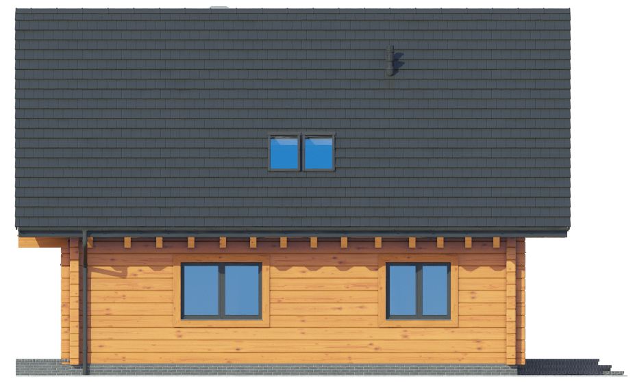 Wysokość ścianki kolankowej: 0.76 m. Strop: drewniany. Pokrycie dachu: dachówka ceramiczna. Ściany zewnętrzne: płazy drewniane + wełna mineralna + deska. Ściany wewnętrzne: płazy drewniane. Typ ogrzewania: kocioł gazowy lub kocioł na paliwo stałe. Inne: okna połaciowe Velux.