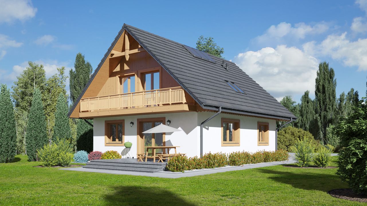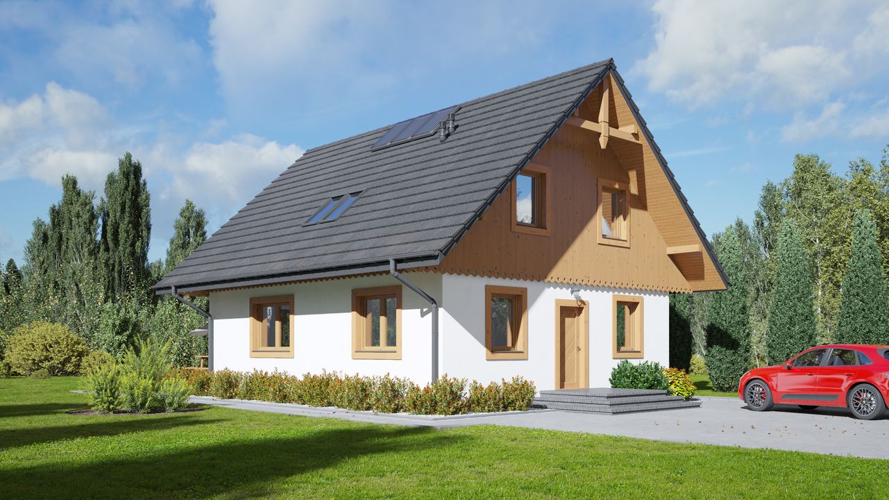 Wysokość ścianki kolankowej: 0.89 m. Strop: drewniany. Pokrycie dachu: dachówka gontopodobna Gerard Corona. Ściany zewnętrzne: szkieletowe drewniane ocieplone wełną mineralną. Ściany wewnętrzne: szkieletowe drewniane. Typ ogrzewania: kocioł gazowy lub kocioł na paliwo stałe. Instalacje dodatkowe: instalacja solarna. Inne: okna połaciowe Velux.