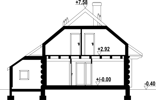 Wysokość ścianki kolankowej: 0.95 m. Strop: drewniany. Pokrycie dachu: dachówka ceramiczna. Ściany zewnętrzne: płazy drewniane + wełna mineralna + deska. Ściany wewnętrzne: płazy drewniane. Typ ogrzewania: ogrzewanie elektryczne. Instalacje dodatkowe: instalacja wentylacji mech. z rekuperacją, instalacja solarna. Inne: okna połaciowe Velux.