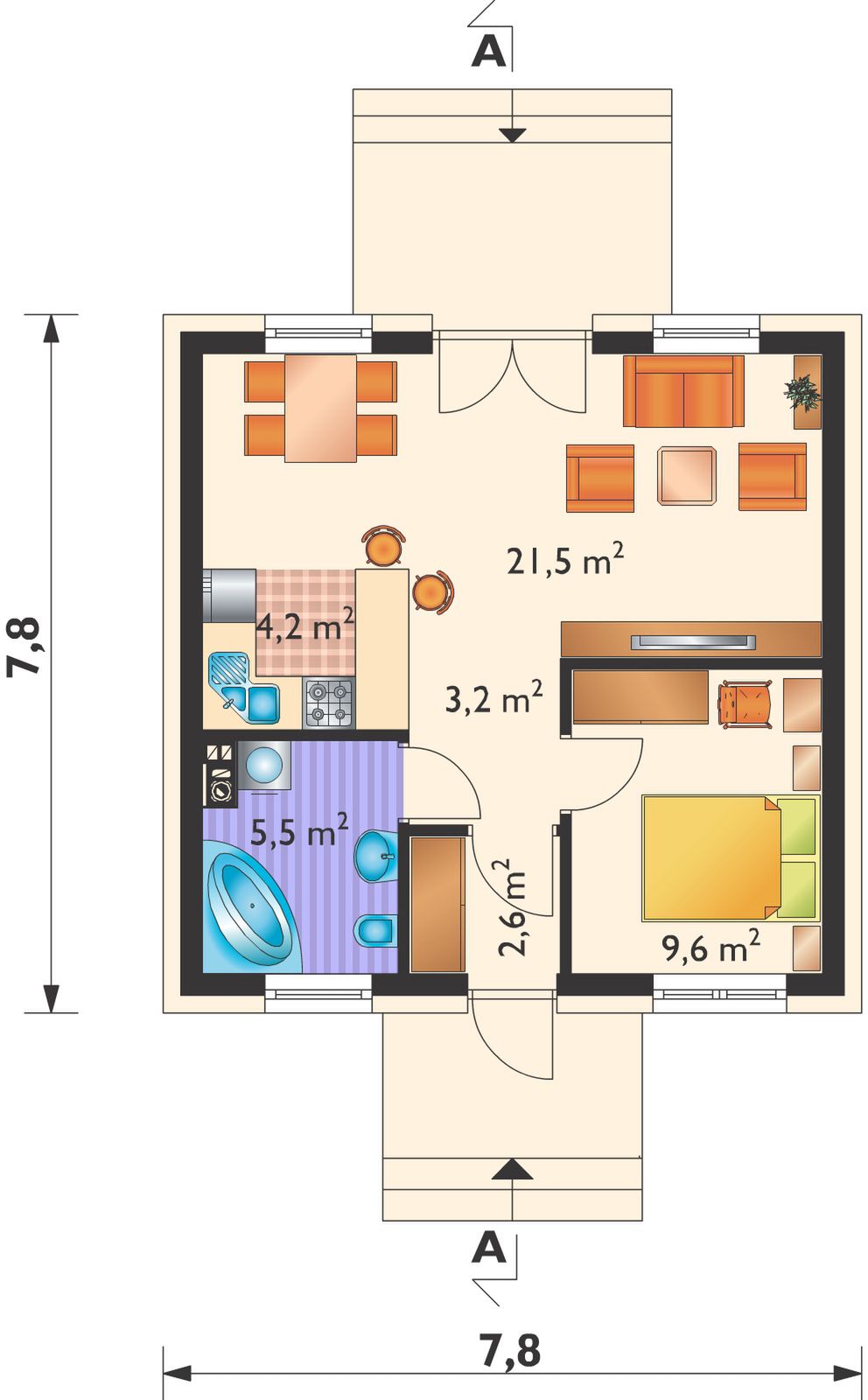 Graficzne opracowanie rzutów poglądowych widocznych na karcie projektu zostało wykonane przez Extradom.pl. Prezentowane przez Extradom.pl wizualizacje wykonane zostały przez autora projektu i należy poczytywać je jedynie za przykład i propozycję wykończenia, wizję architektoniczną autora projektu. Ostateczne wykończenie budynku może nastąpić na wiele sposobów. Szczegółowe rozwiązania zastosowane w oferowanej dokumentacji - w tym również ilość, lokalizacje i wygląd okien, drzwi, kominów - mogą w niewielkim stopniu różnić się od prezentowanej wizualizacji budynku.