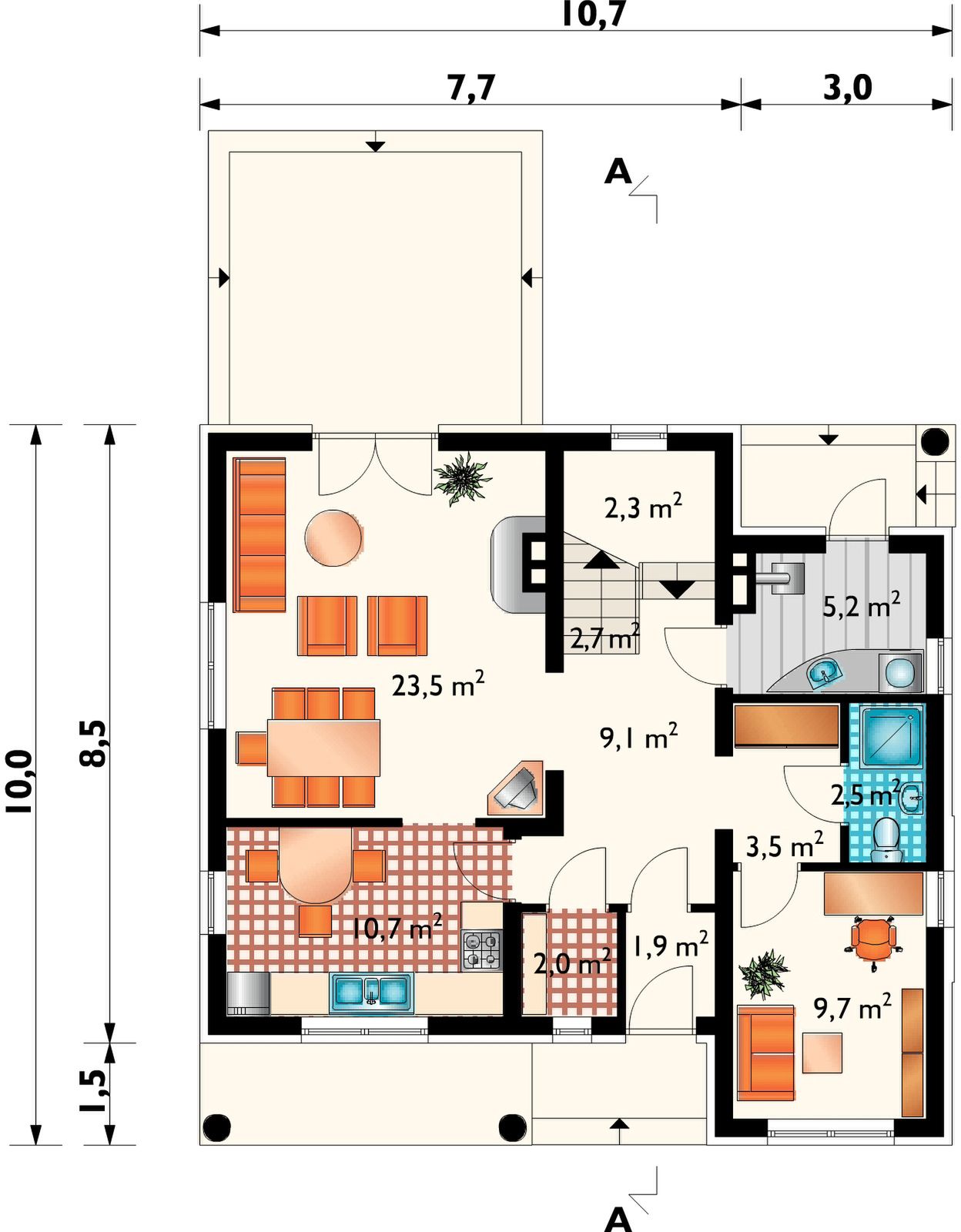 Technologia i konstrukcja: murowana – ceramika. Ściany zewnętrzne: cegła kratówka + styropian. Ściany wewnętrzne: cegła kratówka. Strop: żelbetowy. Konstrukcja dachu: drewniana, jętkowa. Rodzaj schodów: żelbetowe. Typ ogrzewania: kocioł na gaz. Aneks na paliwo stałe: dostępny (zapytaj o cenę). Pokrycie dachu: dachówka ceramiczna lub blacha dachówkowa. Elewacja: tynk cienkowarstwowy.