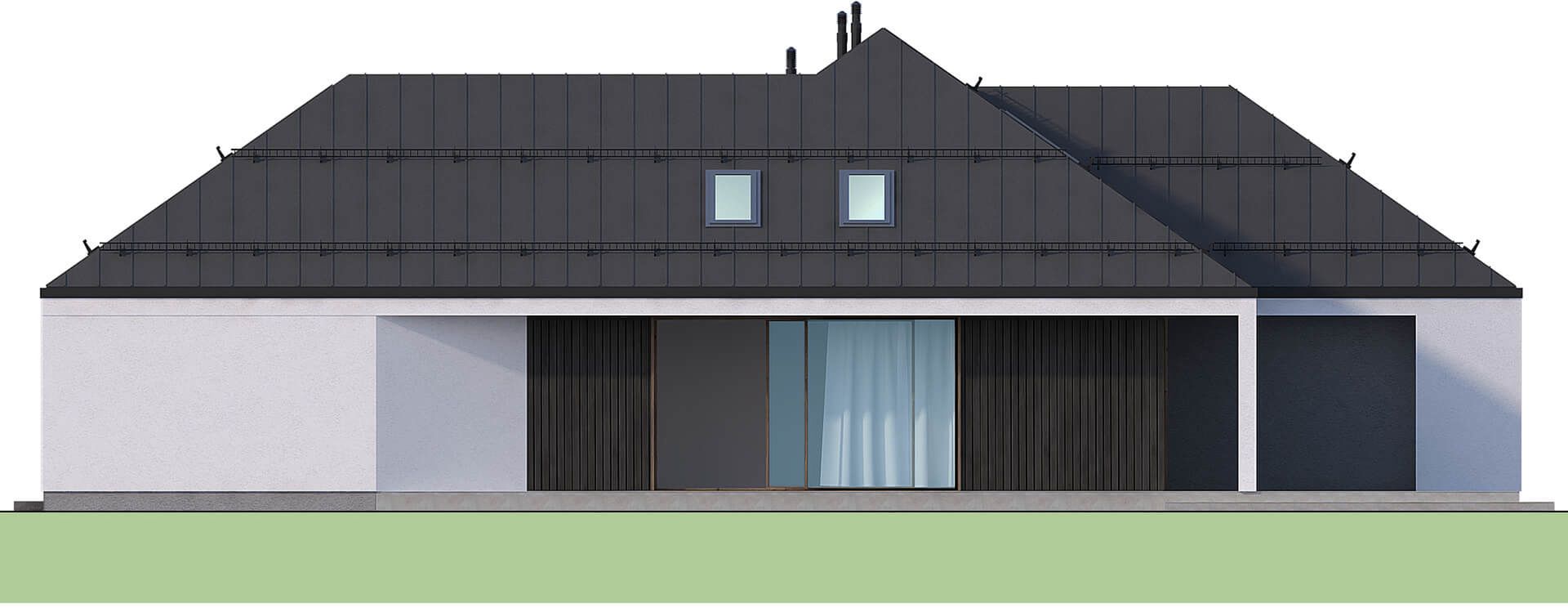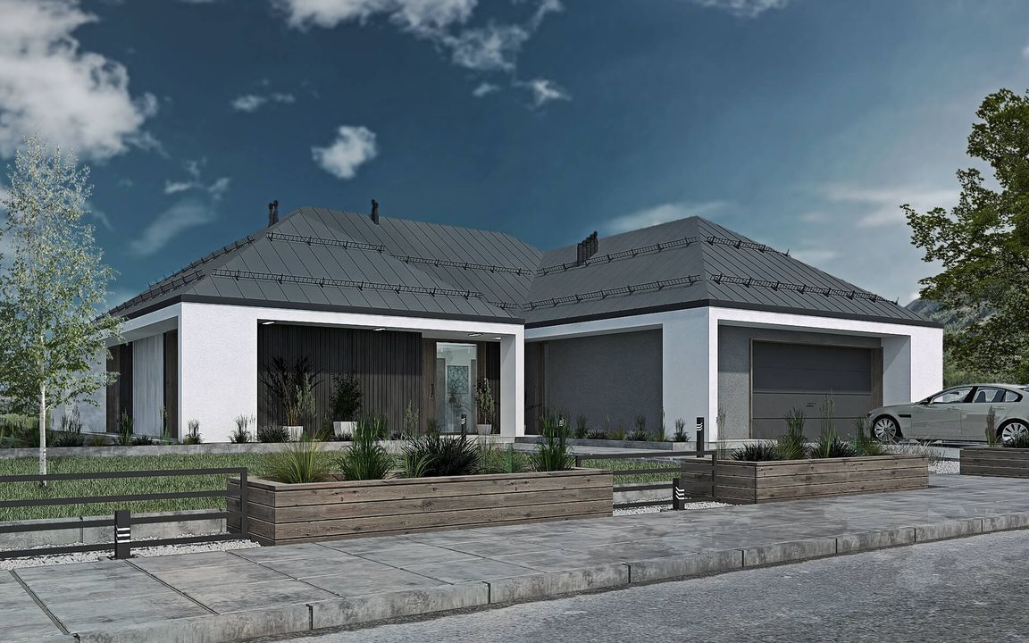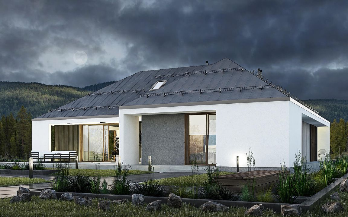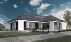 Graficzne opracowanie rzutów poglądowych widocznych na karcie projektu zostało wykonane przez Extradom.pl. Prezentowane przez Extradom.pl wizualizacje wykonane zostały przez autora projektu i należy poczytywać je jedynie za przykład i propozycję wykończenia, wizję architektoniczną autora projektu. Ostateczne wykończenie budynku może nastąpić na wiele sposobów. Szczegółowe rozwiązania zastosowane w oferowanej dokumentacji - w tym również ilość, lokalizacje i wygląd okien, drzwi, kominów - mogą w niewielkim stopniu różnić się od prezentowanej wizualizacji budynku.