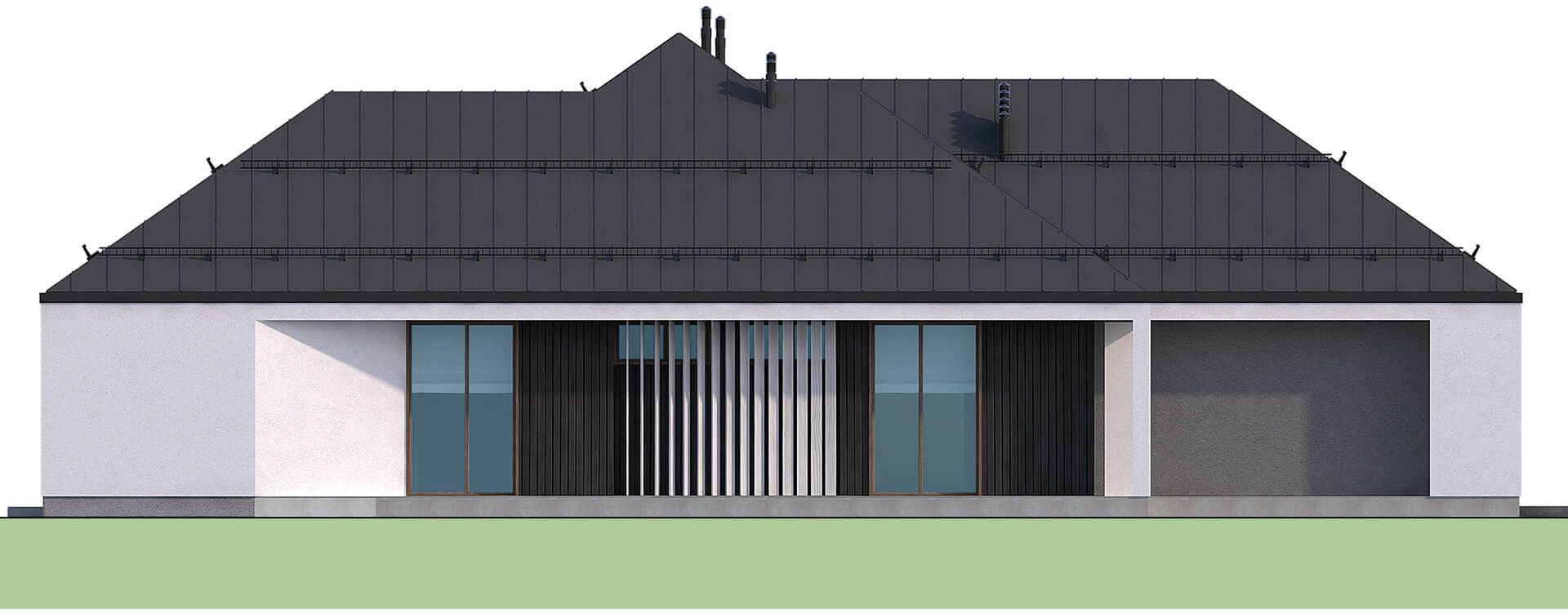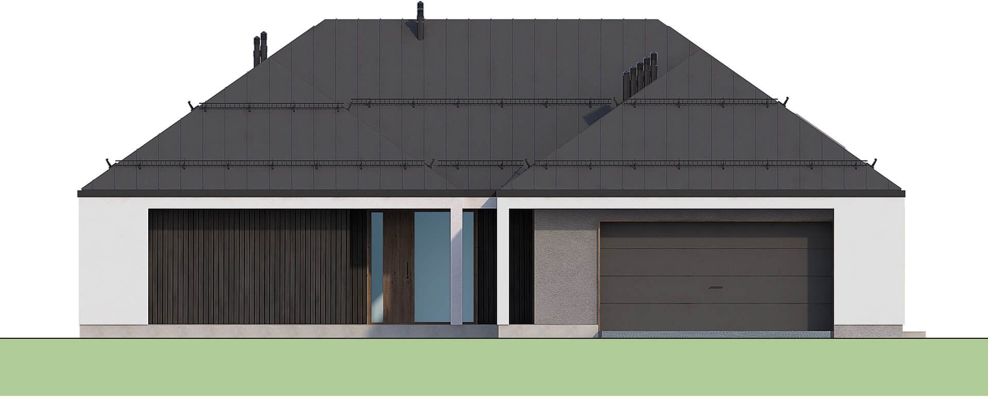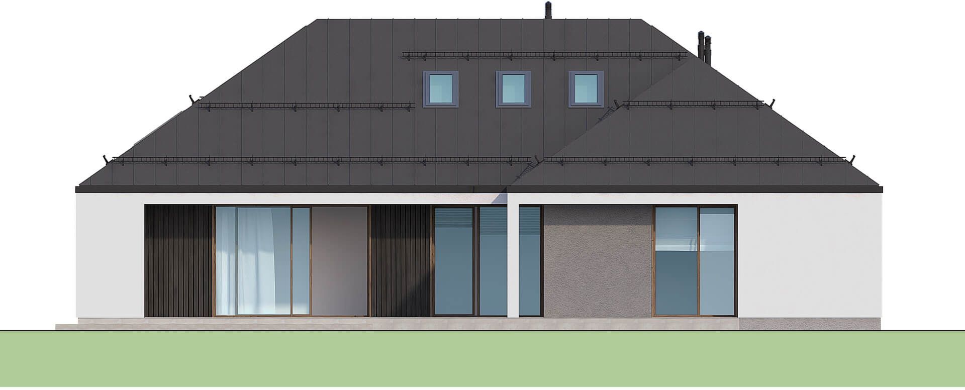 Graficzne opracowanie rzutów poglądowych widocznych na karcie projektu zostało wykonane przez Extradom.pl. Prezentowane przez Extradom.pl wizualizacje wykonane zostały przez autora projektu i należy poczytywać je jedynie za przykład i propozycję wykończenia, wizję architektoniczną autora projektu. Ostateczne wykończenie budynku może nastąpić na wiele sposobów. Szczegółowe rozwiązania zastosowane w oferowanej dokumentacji - w tym również ilość, lokalizacje i wygląd okien, drzwi, kominów - mogą w niewielkim stopniu różnić się od prezentowanej wizualizacji budynku.