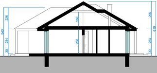 Fundamenty: ławy żelbetowe. Ściany konstrukcja: pustak ceramiczny Porotherm. Ściany elewacja: tynk + drewno. Stropy: drewniane. Dach konstrukcja: więźba drewniana płatwiowo-kleszczowa. Dach pokrycie: dachówka ceramiczna. Schody: brak. Ogrzewanie kocioł: kocioł gazowy dwufunkcyjny. Ogrzewanie grzejniki: grzejniki ścienne + ogrzewanie podłogowe.