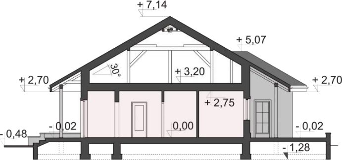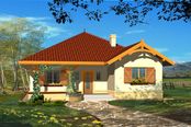 Konstrukcja ściany zewnętrzne - beton komórkowy gr.24 + styropian Termo Organika Termonium Plus gr. 12cm; ściany wewnetrzne - bloczki z betonu komórkowego gr.24cm; ściany fundamentowe - bloczek betonowy; strop -drewniany; konstrukcja dachu - drewniana Instalacje W projekcie przewidziano instalacjie: c.o. i c.w.u., grzejniki płytowe, instalacje wodno-kanalizacyjna oraz elektryczne, wentylacja grawitacyjna. Wykończenie pokrycie dachowe - dachówka cementowa (w ramach adaptacji inny materiał); ścianki działowe na parterze - bloczki silikatowe; na poddaszu z płyt gipsowo-kartonowych; schody drewniane - zabiegowe, okna - PVC, wyłaz dachowy i stropowy - Fakro;