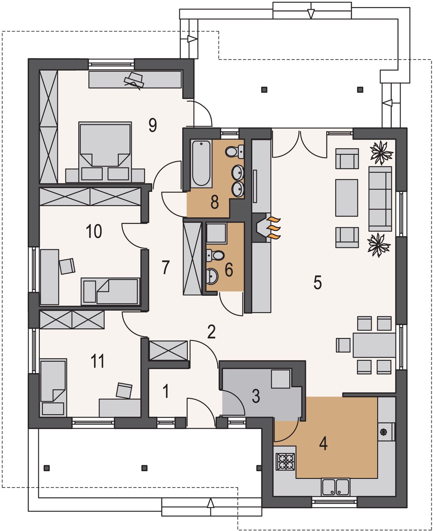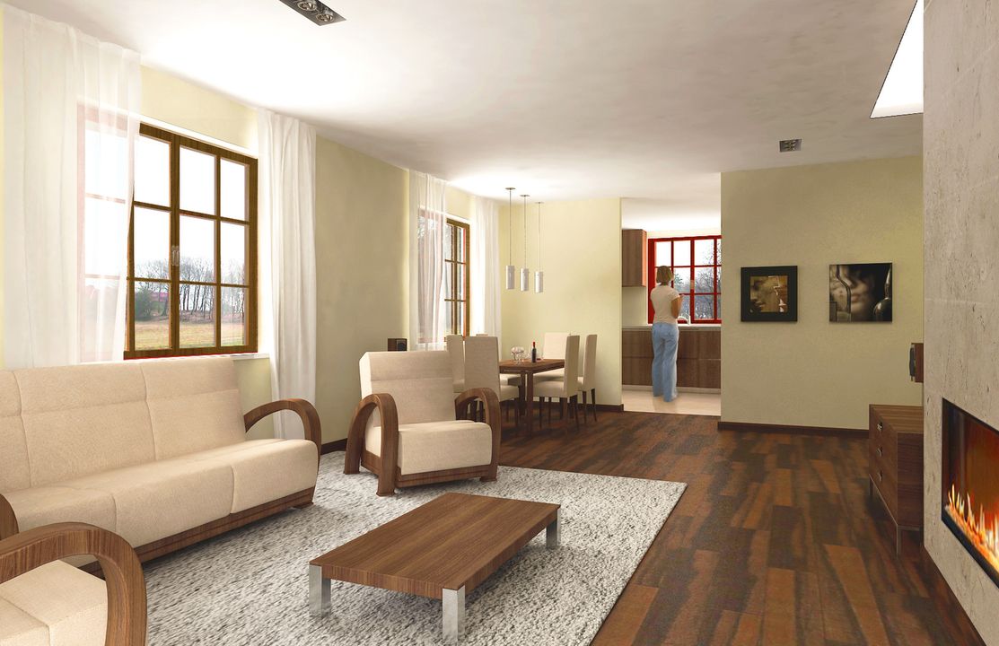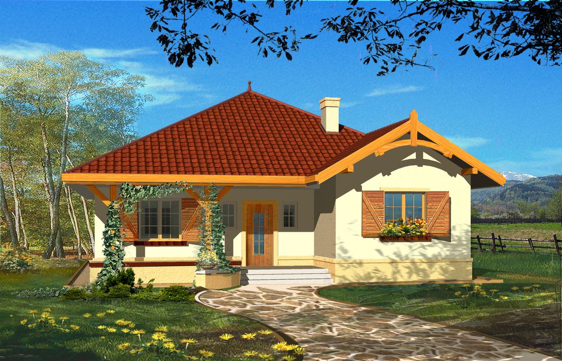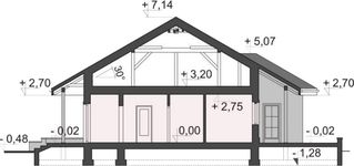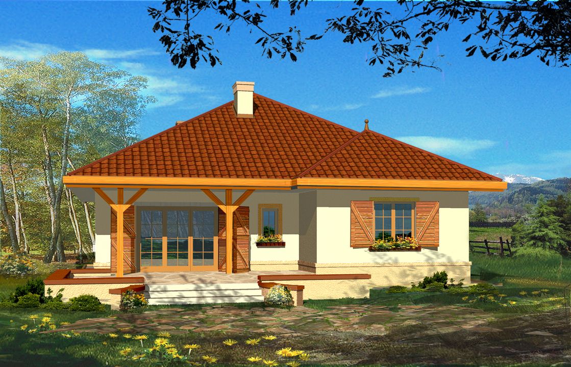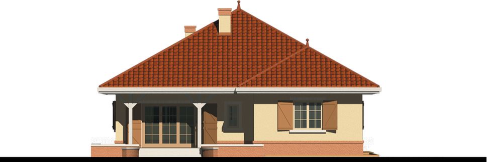 Graficzne opracowanie rzutów poglądowych widocznych na karcie projektu zostało wykonane przez Extradom.pl. Prezentowane przez Extradom.pl wizualizacje wykonane zostały przez autora projektu i należy poczytywać je jedynie za przykład i propozycję wykończenia, wizję architektoniczną autora projektu. Ostateczne wykończenie budynku może nastąpić na wiele sposobów. Szczegółowe rozwiązania zastosowane w oferowanej dokumentacji - w tym również ilość, lokalizacje i wygląd okien, drzwi, kominów - mogą w niewielkim stopniu różnić się od prezentowanej wizualizacji budynku.