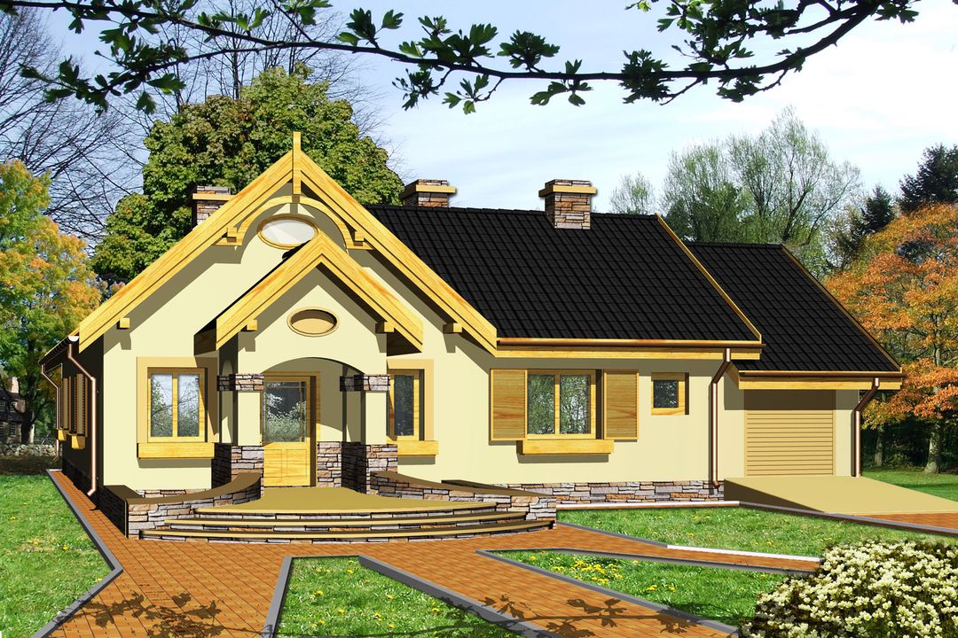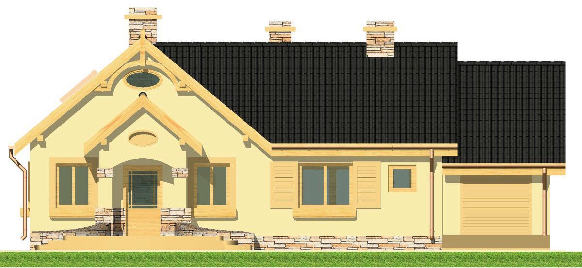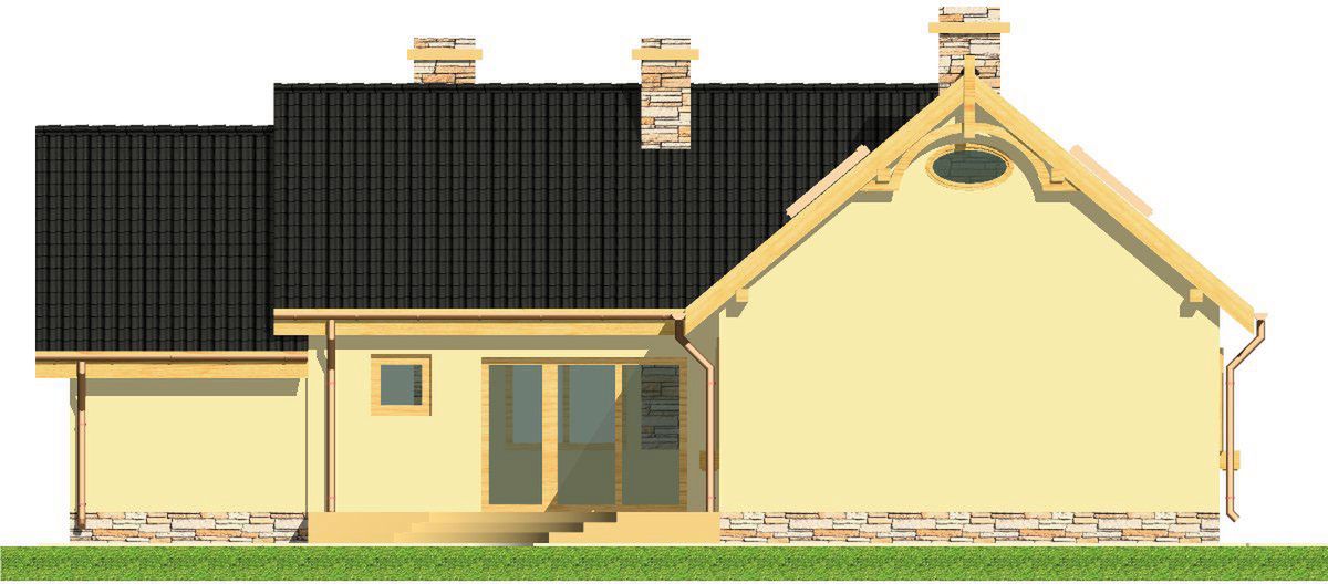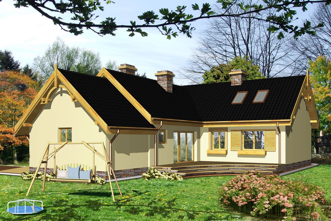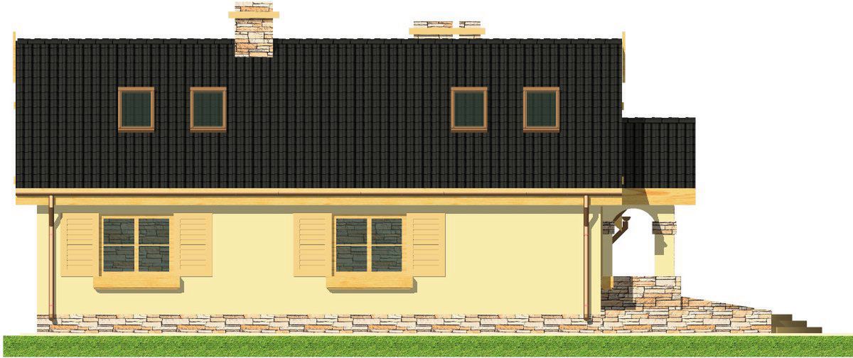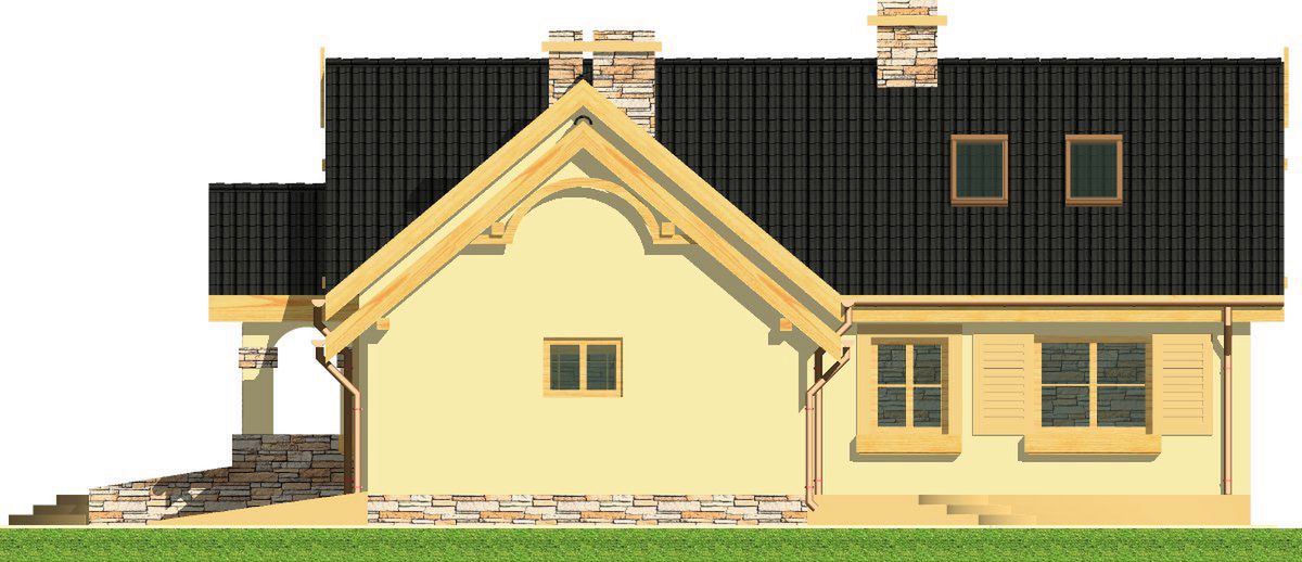 Graficzne opracowanie rzutów poglądowych widocznych na karcie projektu zostało wykonane przez Extradom.pl. Prezentowane przez Extradom.pl wizualizacje wykonane zostały przez autora projektu i należy poczytywać je jedynie za przykład i propozycję wykończenia, wizję architektoniczną autora projektu. Ostateczne wykończenie budynku może nastąpić na wiele sposobów. Szczegółowe rozwiązania zastosowane w oferowanej dokumentacji - w tym również ilość, lokalizacje i wygląd okien, drzwi, kominów - mogą w niewielkim stopniu różnić się od prezentowanej wizualizacji budynku.