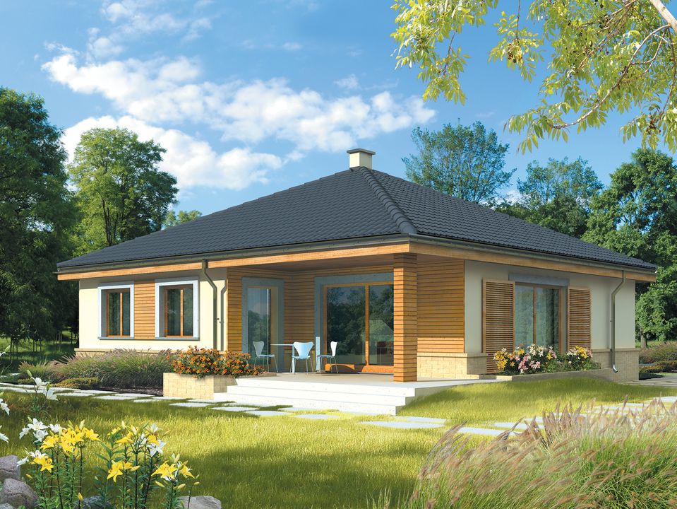 Ściany zewnętrzne: murowane. Strop: gęstożebrowy. Dach: konstrukcja drewniana, dachówka ceramiczna lub cementowa. Ogrzewanie: kocioł gazowy, rozprowadzenie ciepła: grzejniki. Wentylacja: grawitacyjna. Elewacje: tynk mineralny i okładzina drewniana, cokół z cegły klinkierowej. Stolarka: drewniana lub PCV. Rolety zewnętrzne naokienne..