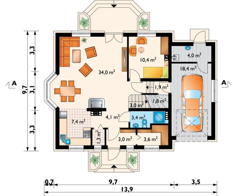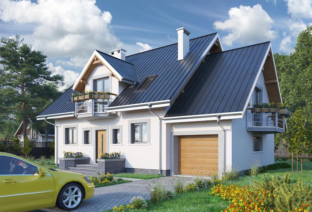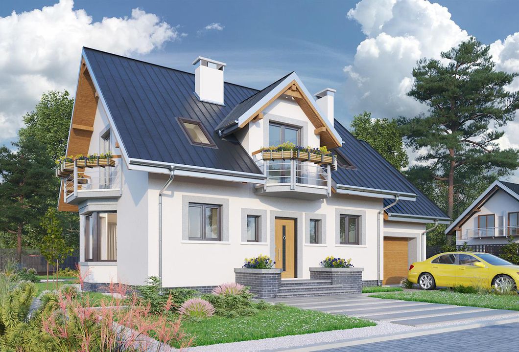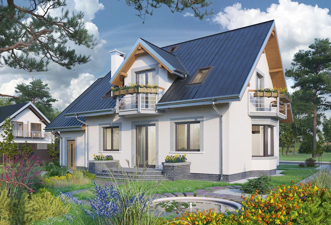 Graficzne opracowanie rzutów poglądowych widocznych na karcie projektu zostało wykonane przez Extradom.pl. Prezentowane przez Extradom.pl wizualizacje wykonane zostały przez autora projektu i należy poczytywać je jedynie za przykład i propozycję wykończenia, wizję architektoniczną autora projektu. Ostateczne wykończenie budynku może nastąpić na wiele sposobów. Szczegółowe rozwiązania zastosowane w oferowanej dokumentacji - w tym również ilość, lokalizacje i wygląd okien, drzwi, kominów - mogą w niewielkim stopniu różnić się od prezentowanej wizualizacji budynku.