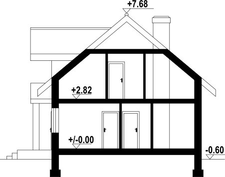 Wysokość ścianki kolankowej: 1.03 m. Strop: płyta żelbetowa. Pokrycie dachu: dachówka ceramiczna. Ściany zewnętrzne: pustaki ceramiczne + styropian. Ściany wewnętrzne: pustaki ceramiczne. Typ ogrzewania: kocioł gazowy.