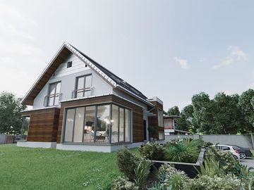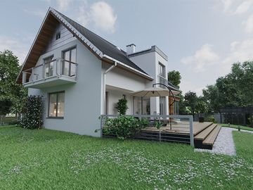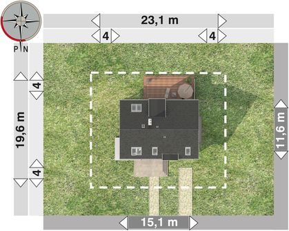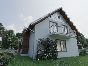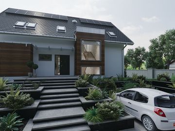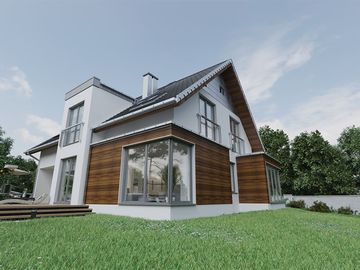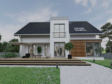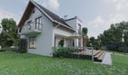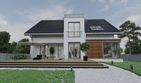 Graficzne opracowanie rzutów poglądowych widocznych na karcie projektu zostało wykonane przez Extradom.pl. Prezentowane przez Extradom.pl wizualizacje wykonane zostały przez autora projektu i należy poczytywać je jedynie za przykład i propozycję wykończenia, wizję architektoniczną autora projektu. Ostateczne wykończenie budynku może nastąpić na wiele sposobów. Szczegółowe rozwiązania zastosowane w oferowanej dokumentacji - w tym również ilość, lokalizacje i wygląd okien, drzwi, kominów - mogą w niewielkim stopniu różnić się od prezentowanej wizualizacji budynku.