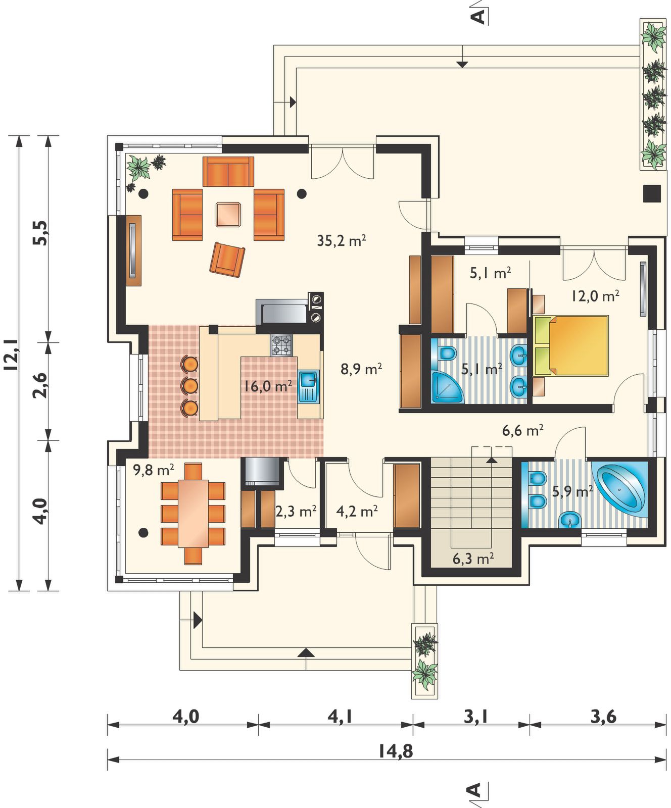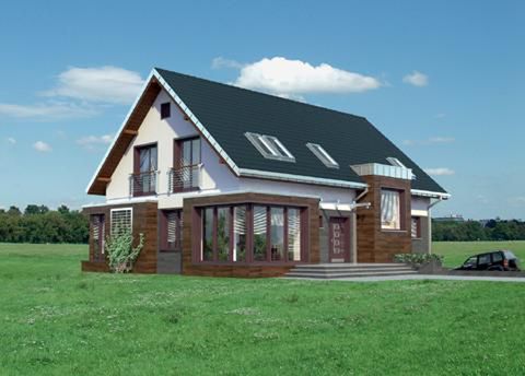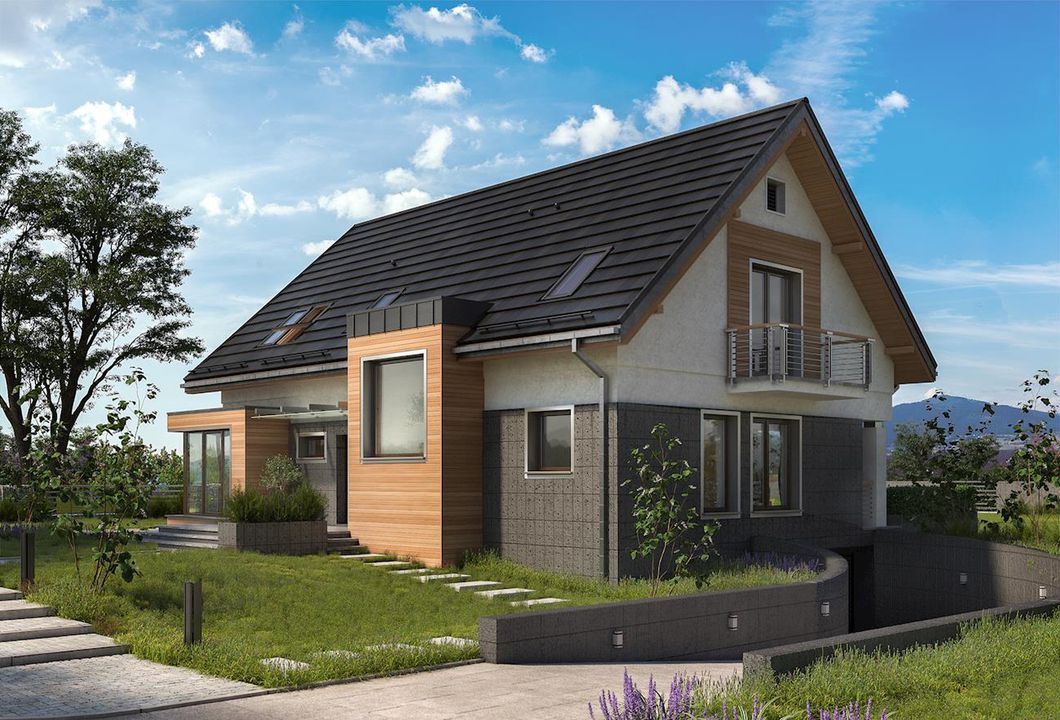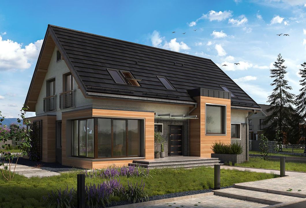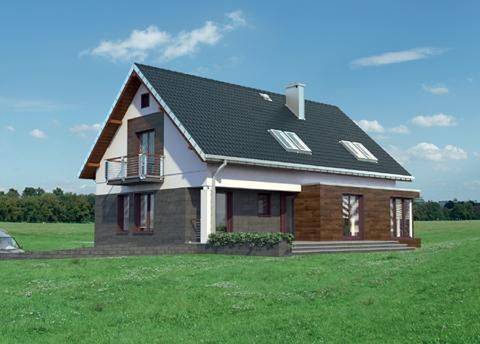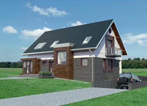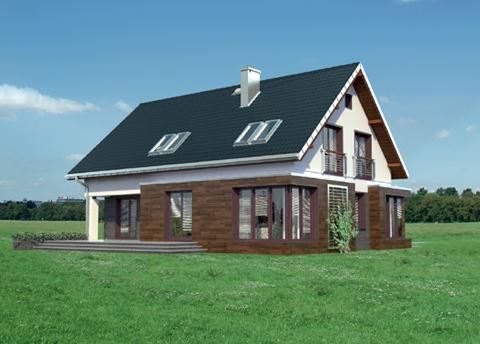 Graficzne opracowanie rzutów poglądowych widocznych na karcie projektu zostało wykonane przez Extradom.pl. Prezentowane przez Extradom.pl wizualizacje wykonane zostały przez autora projektu i należy poczytywać je jedynie za przykład i propozycję wykończenia, wizję architektoniczną autora projektu. Ostateczne wykończenie budynku może nastąpić na wiele sposobów. Szczegółowe rozwiązania zastosowane w oferowanej dokumentacji - w tym również ilość, lokalizacje i wygląd okien, drzwi, kominów - mogą w niewielkim stopniu różnić się od prezentowanej wizualizacji budynku.