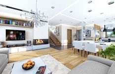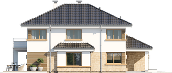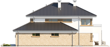 Graficzne opracowanie rzutów poglądowych widocznych na karcie projektu zostało wykonane przez Extradom.pl. Prezentowane przez Extradom.pl wizualizacje wykonane zostały przez autora projektu i należy poczytywać je jedynie za przykład i propozycję wykończenia, wizję architektoniczną autora projektu. Ostateczne wykończenie budynku może nastąpić na wiele sposobów. Szczegółowe rozwiązania zastosowane w oferowanej dokumentacji - w tym również ilość, lokalizacje i wygląd okien, drzwi, kominów - mogą w niewielkim stopniu różnić się od prezentowanej wizualizacji budynku.