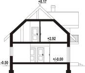 Wysokość ścianki kolankowej: 1.01 m. Strop: płyta żelbetowa. Pokrycie dachu: dachówka ceramiczna. Ściany zewnętrzne: pustaki ceramiczne + styropian. Ściany wewnętrzne: pustaki ceramiczne. Typ ogrzewania: kocioł gazowy. Inne: okna połaciowe Fakro.