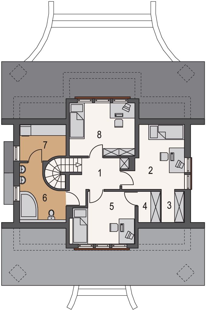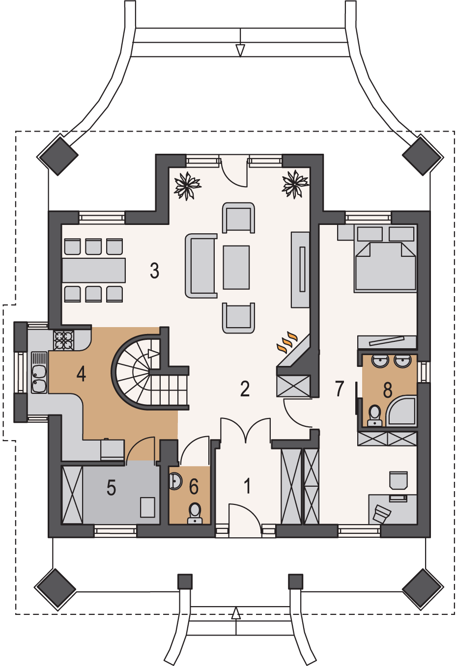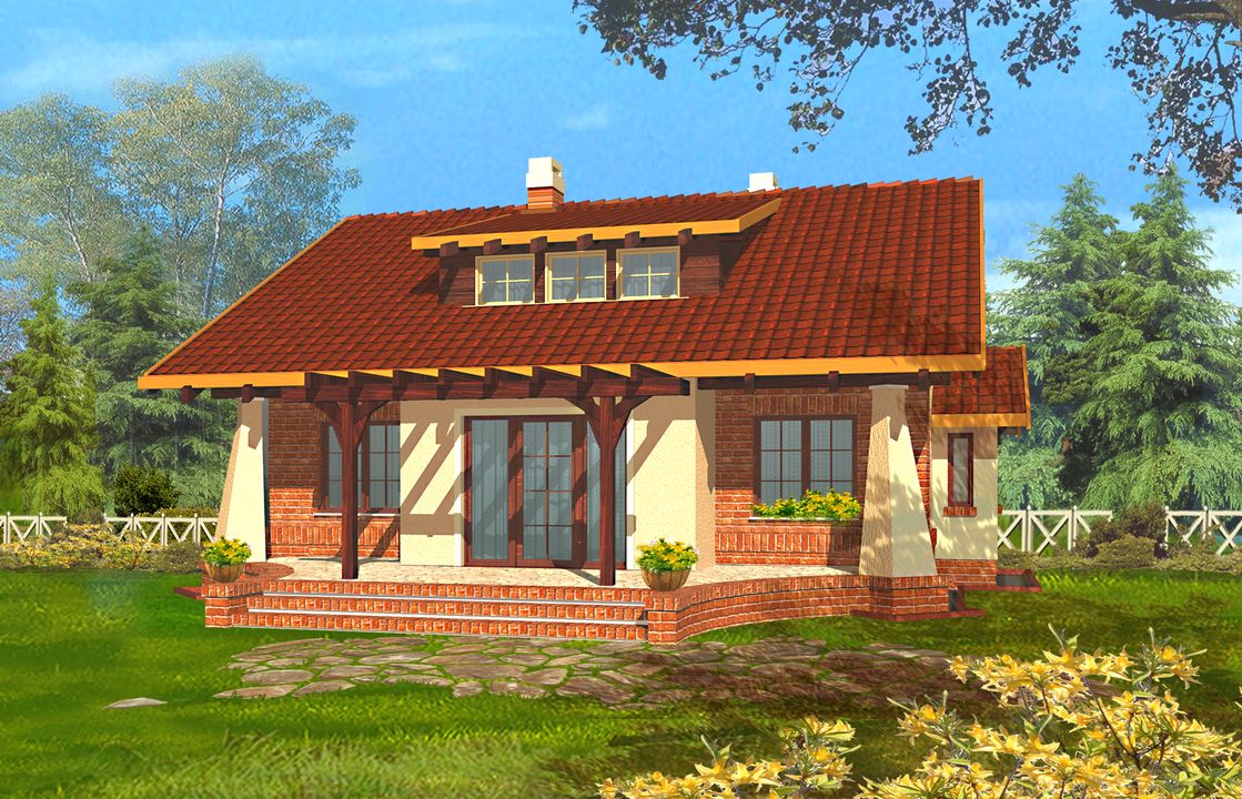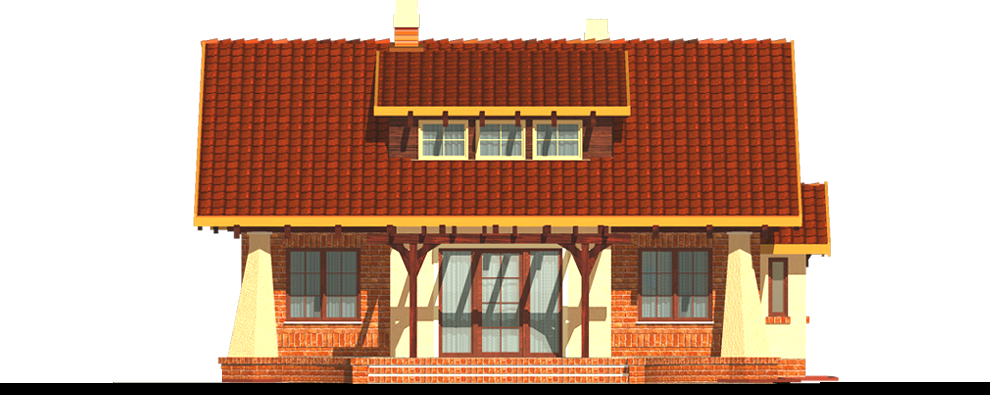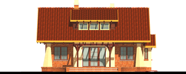 Graficzne opracowanie rzutów poglądowych widocznych na karcie projektu zostało wykonane przez Extradom.pl. Prezentowane przez Extradom.pl wizualizacje wykonane zostały przez autora projektu i należy poczytywać je jedynie za przykład i propozycję wykończenia, wizję architektoniczną autora projektu. Ostateczne wykończenie budynku może nastąpić na wiele sposobów. Szczegółowe rozwiązania zastosowane w oferowanej dokumentacji - w tym również ilość, lokalizacje i wygląd okien, drzwi, kominów - mogą w niewielkim stopniu różnić się od prezentowanej wizualizacji budynku.