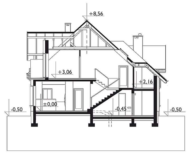 Wersja technologiczna: murowana - beton komórkowy. Izolacja termiczna ścian zewnętrznych: Austrotherm. Strop: żelbetowy monolityczny. Typ schodów: płytowe żelbetowe. Konstrukcja dachu: drewniana mieszana. Typ ogrzewania: Kocioł na gaz. Dostępna wersja z pompą ciepła: Tak. Ściany zewnętrzne: 30 cm beton komórkowy. Ściany wewnętrzne: 24 cm beton komórkowy. Ściany wewnętrzne działowe: 11 cm beton komórkowy.