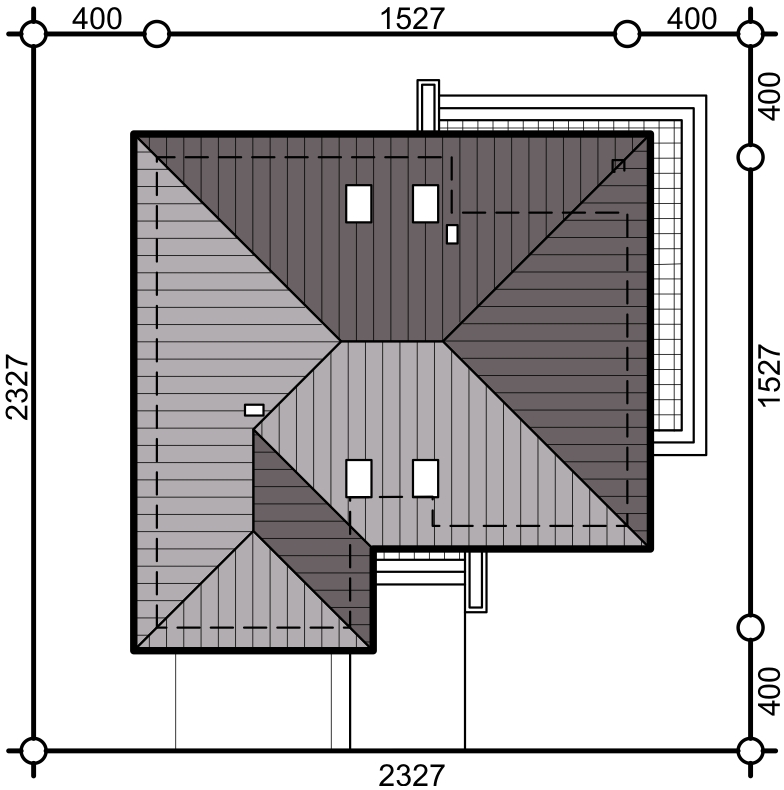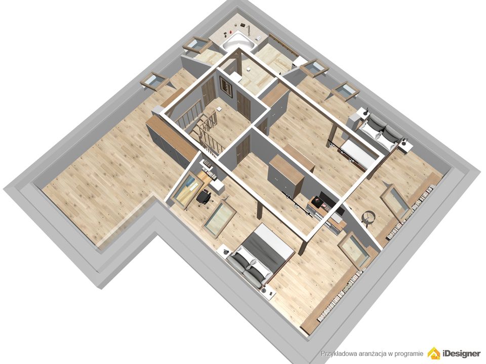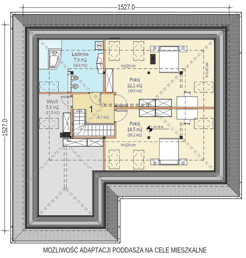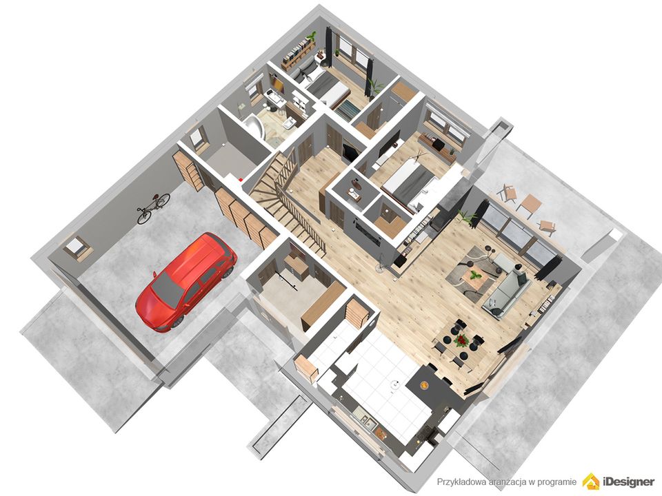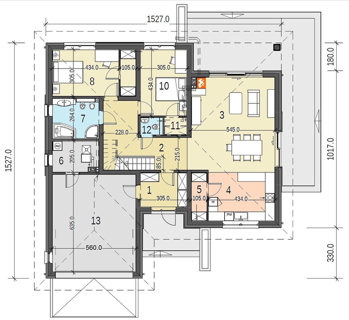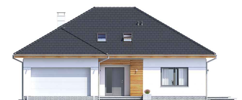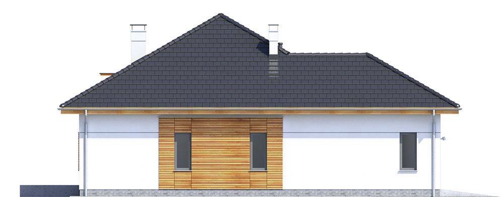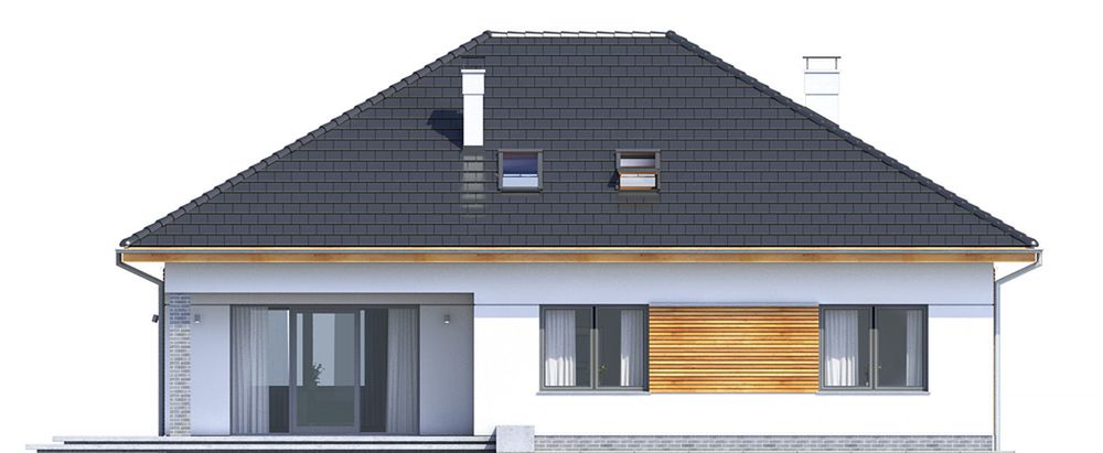 Graficzne opracowanie rzutów poglądowych widocznych na karcie projektu zostało wykonane przez Extradom.pl. Prezentowane przez Extradom.pl wizualizacje wykonane zostały przez autora projektu i należy poczytywać je jedynie za przykład i propozycję wykończenia, wizję architektoniczną autora projektu. Ostateczne wykończenie budynku może nastąpić na wiele sposobów. Szczegółowe rozwiązania zastosowane w oferowanej dokumentacji - w tym również ilość, lokalizacje i wygląd okien, drzwi, kominów - mogą w niewielkim stopniu różnić się od prezentowanej wizualizacji budynku.