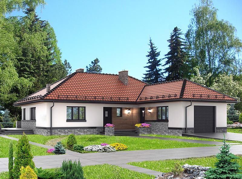 Zdecydowałem się na projekt domu HG-D2B KRM1059, ponieważ bardzo odpowiadał nam jego układ pomieszczeń oraz metraż. Zależało nam na budynku parterowym o powierzchni ok. 100m2, więc ten projekt, jak najbardziej spełniał nasze wymagania. Spodobało nam się również to, iż dwie sypialnie są w nim w znacznej odległości od strefy dziennej.Projekt jest dobrze rozrysowany i nie mieliśmy żadnych trudności z jego czytelnością. Z postawieniem budynku, położeniem stropu i dachu również nie mieliśmy problemów. Nieco kłopotów pojawiło się na późniejszym etapie realizacji, ale myślę że na każdej budowie to się zdarza i trzeba sobie z tym poradzić. Zmieniłem nieco materiały do budowy i zamiast polecanych przez projektanta pustaków MAX, użyłem bloczków Porotherm. Do ocieplenia ścian zastosowałem 20cm warstwę styropianu Termo Organika Gold Fasada.Dom ogrzewamy pompą ciepła. Swego czasu dużo dowiedziałem się w szkole na temat tego rozwiązania i postanowiłem zaufać tej wiedzy. Ponadto nie mamy gazu w okolicy, a nie chciałem też instalować pieca na paliwo stałe, gdyż jest przy nim wiele pracy. Pompa jest bezproblemowym systemem grzania i jestem z niej bardzo zadowolony, tym bardziej, że część prac z nią związanych wykonałem sam z kolegą. Dolne źródło wykonaliśmy we własnym zakresie, a dopiero potem firma dokończyła instalację. Wszystko jest dobrze zrobione i działa sprawnie.Dokonałem w projekcie domu parterowego HG-D2B KRM1059 kilku modyfikacji. Ze względu na to, iż zależało mi na doświetleniu łazienki światłem słonecznym, postanowiłem zrobić ją w miejscu dwóch garderób naprzeciwko niej. W pierwotnym miejscu nie posiadała ona żadnych okien, więc tą powierzchnię przeznaczyliśmy na jedną dużą garderobę, w której słońce jest w zasadzie zbędne. Ponieważ ogrzewamy dom pompą, przeniosłem kotłownię do garażu. W jej miejscu zrobiłem drugą łazienkę i tym samym zrezygnowałem z małej ubikacji. Pojawiła się dzięki temu świetna powierzchnia do wstawienia dużej szafy wnękowej w przedpokoju. Postanowiłem nie robić narożnego okna w salonie, a na tej ścianie powiesiłem telewizor. Zamieniłem również miejscami drzwi tarasowe z oknem w części dziennej. Trochę żałuję, iż nie powiększyłem nieco garażu, ponieważ przez to, że umieściłem tam kotłownię, nie ma w nim za wiele miejsca. Dom położony mamy w ten sposób, iż małe sypialnie i garaż znajdują się po stronie wschodniej. Jednocześnie do części dziennej słońce wpada przez okna wychodzące na zachód, północ i południe. Dzięki temu salon i kuchnia są dobrze oświetlone przez cały dzień. Całą budowę mogę uznać za naprawdę duży sukces. Układ pomieszczeń w naszym domu jest bardzo funkcjonalny i nic bym już w nim nie zmienił. Jestem też zadowolony, iż udało mi się wykonać w dużej mierze sam pompę ciepła. Spiżarka w domu jest rewelacyjną sprawą. Dzięki niej łatwo utrzymać w kuchni porządek i estetyczny wygląd. Postawienie domu było moim ogromnym marzeniem od dzieciństwa. Bardzo się cieszę, iż zostało w końcu zrealizowane. Wybór projektu domu HG-D2B KRM1059 był trafną decyzją. Polecam i pozdrawiam.
